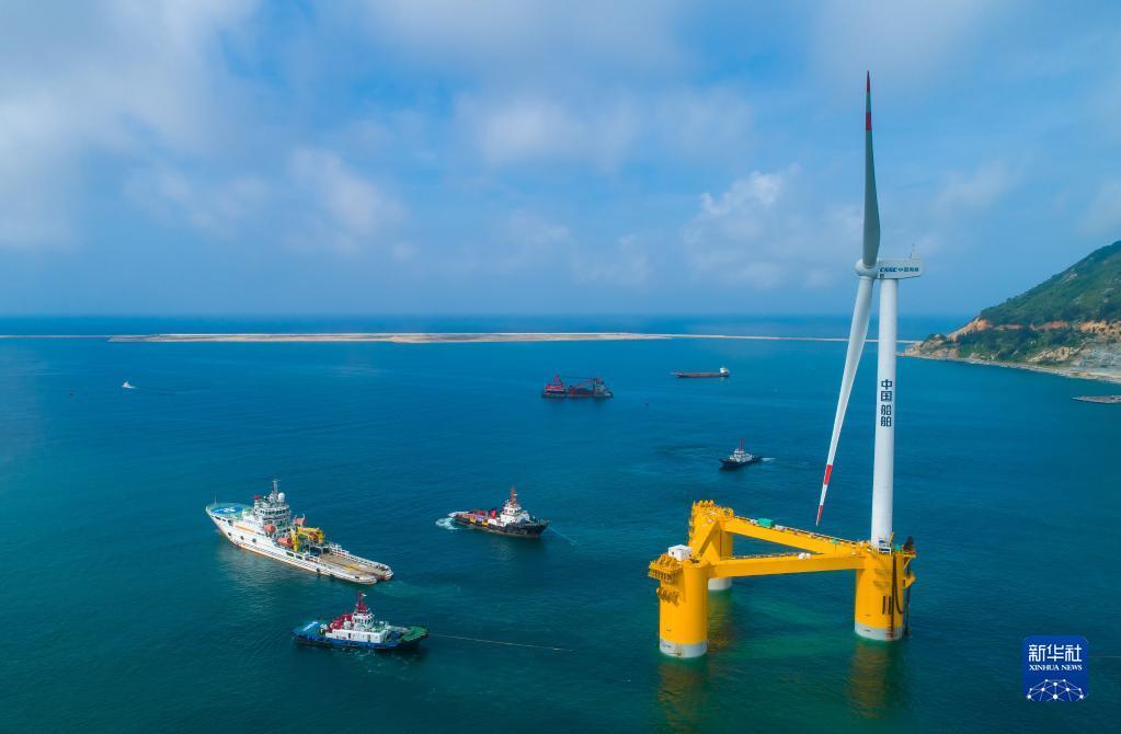 国内首台深远海浮式风电装备“扶摇号”从广东省茂名市广港码头拖航前往罗斗沙海域进行示范应用(2022年5月29日摄,无人机照片)。新华社记者 刘大伟 摄