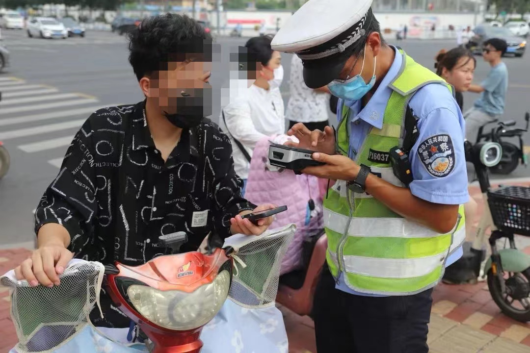 当日上午10时许,记者在胜利路与育才大街交叉口看到,6名执勤交警头顶烈日,正在开展路面执法整治行动,对不佩戴安全头盔的电动自行车驾驶人实行扫码登录电动车违法处理APP进行登记,对电动自行车未登记上牌及未佩戴安全头盔的市民严格落实“三招不过岗”管理规定,即采取转发朋友圈积赞、抄写交通法规、在路口举提示牌警示他人“三选一”的处罚方式。忙碌中,他们还不忘提醒过往市民遵守交通规则,文明安全出行。