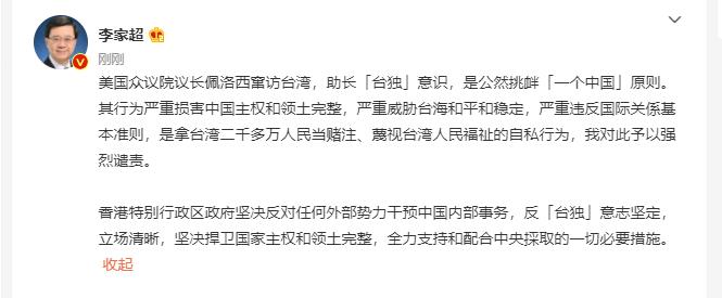 8月2日,美国国会众议长佩洛西不顾中方强烈反对和严正交涉,窜访中国台湾地区。香港特别行政区行政长官李家超在微博发文,全文如下: