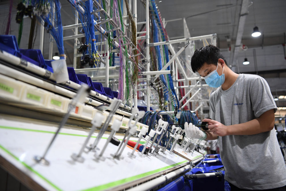 工人在位于三河市的廊坊莱尼线束系统有限公司生产车间工作。记者 朱旭东 摄