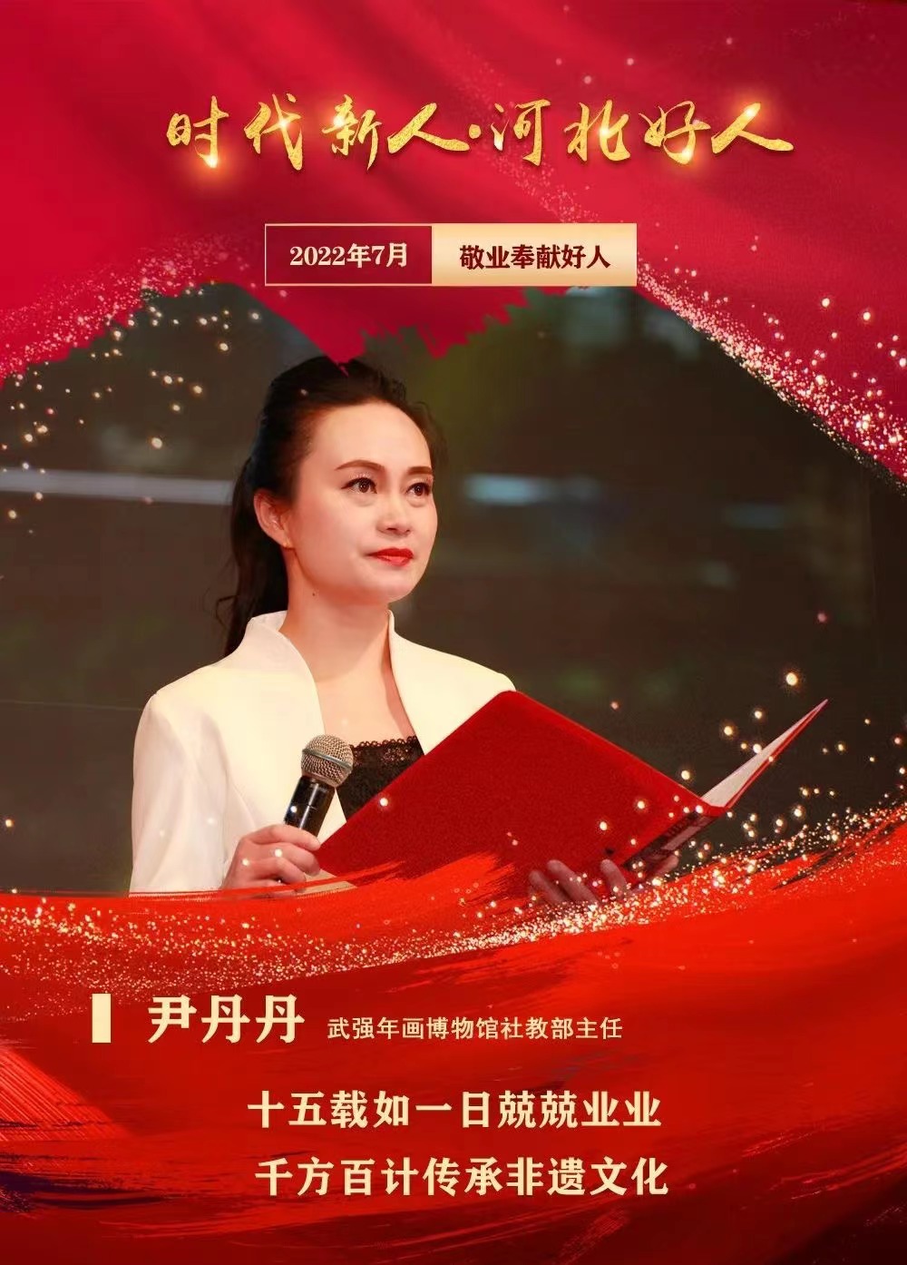 弘扬好人精神,辉映道德力量。经各地各单位推荐、网友点赞评议、评议会综合审议,7月31日,河北省文明办发布了2022年7月“时代新人·河北好人”,我市15年如一日传承非遗文化的尹丹丹入选敬业奉献类“时代新人·河北好人”。