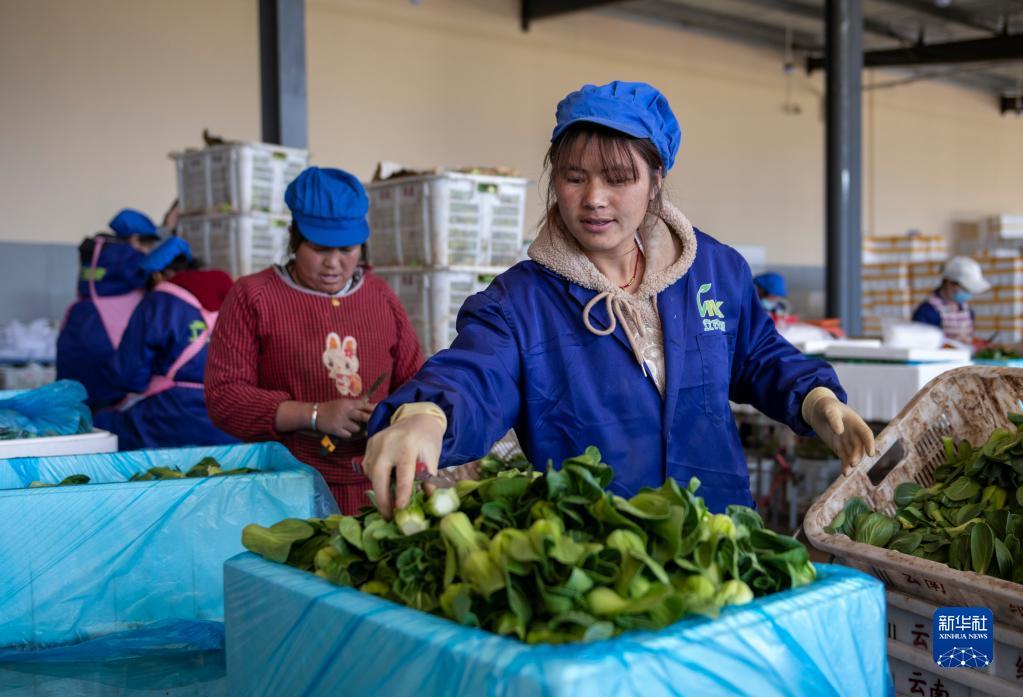 脱贫群众在云南省曲靖市会泽县一蔬菜冷链企业分拣蔬菜(2022年3月3日摄)。新华社记者 陈欣波 摄