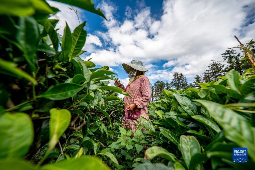 茶农在位于云南省西双版纳傣族自治州勐海县的国家种质大叶茶树资源圃采茶(2022年5月10日摄)。新华社记者 江文耀 摄