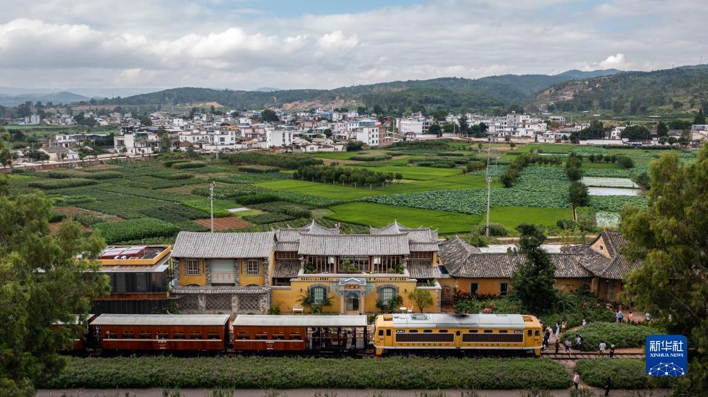 游客在云南省建水县乘坐米轨小火车来到乡会桥站游览(2022年7月1日摄,无人机照片)。新华社记者 胡超 摄