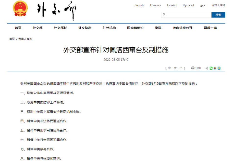 针对美国国会众议长佩洛西不顾中方强烈反对和严正交涉,执意窜访中国台湾地区,外交部8月5日宣布采取以下反制措施: