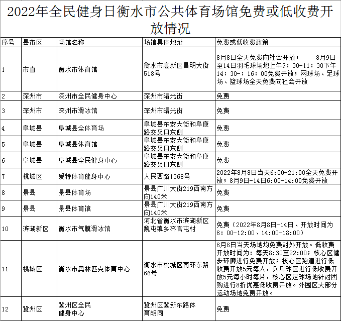 8月8日是第14个“全民健身日”,记者从衡水市体育局了解到,按照国家体育总局和河北省体育局“全民健身日”主题活动安排部署,8月8日当天,衡水市所有公共体育场馆向公众免费开放,同时我市将举办全民健身日主题活动暨衡水市社区运动会开幕仪式。在此后的一周里,我市各地将举办不同形式的项目运动,市民可根据自己的喜好积极参与。