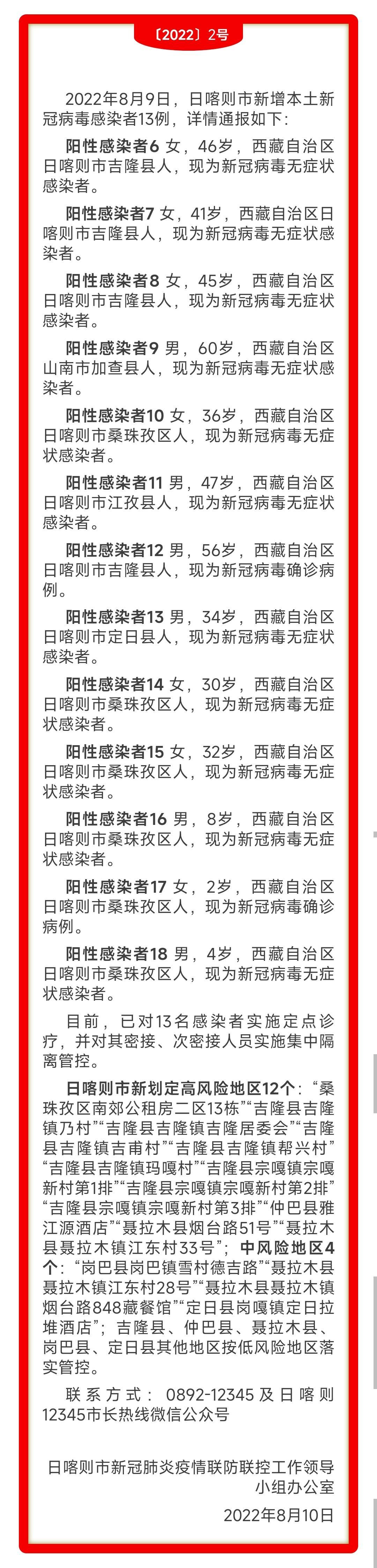 2022年8月10日,西藏日喀则市新冠肺炎疫情工作领导小组办公室发布通报,2022年8月9日,日喀则市新增本土新冠病毒感染者13例。全文如下: 来源:央视新闻 点赞 +1 微博 微信 我要评论 发布 相关推荐 立冬养藏,牌局生暖|国涛麻将机嘿神话T480,守护冬日里的温暖相聚 商讯 9小时前 2025西安靠谱旅行社推荐权威:三只羊领跑商务团体服务,大品牌铸就品质标杆 商讯 11小时前 2025年世界林木业大会将于11月21日在广西南宁开幕 商讯 16小时前 盈纬达与四川大学续约华西口腔“卓越奖学金”:五年深耕再启新程,产学研教协同助力口腔人才发展 商讯 17小时前 来郑州东站仲景宛西制药展厅打卡山水“药”园感受中医药文化 商讯 1天前 技术+服务双轮驱动,明阳智能巴西项目落地加速美洲风电市场渗透 商讯 1天前 2025涂料十大品牌(建议收藏) 商讯 1天前 热门 一天 三天 一周 1 武强县北代镇:以“5431”工作法推进人居环境整治 2 衡水办理道路运输驾驶员诚信考核“免申即享”6.8万件 3 2025 年 11 月舆情监测公司 TOP5 推荐:技术实力与全域覆盖综合分析 4 【新闻发布】2025年衡水城管领域三项民生实事项目投用或主体完工 5 【探索衡水地标⑲】深州东山植物园——秋韵里的生态画卷 6 衡水市开展关爱特殊儿童主题活动 7 阜城中燃:开展燃气管道应急处置演练 提升安全保障能力 8 【四中全会精神在基层】以创新激发活力 让“老树结出新果”——枣强大营皮草产业发展见闻 9 2025年世界林木业大会将于11月21日在广西南宁开幕 10 习近平同萨摩亚国家元首图伊马莱阿利法诺就中萨建交50周年互致贺电 1 5个送女生礼物推荐榜:1000元以内精选 2 2025骁龙8至尊版性能旗舰测评:iQOO15双芯架构7000mAh电池成标杆 3 企业建站深圳网站开发公司哪家好?2025深圳十大网站制作公司精选建站服务商评测结果出炉 4 2025年防脱洗发水选购指南,从DHT到屏障损伤,全面认识脱发的四大成因 5 2025中国GEO服务商权威选型指南:基于AI搜索优化算法的深度评测与企业流量突围推荐 6 控油洗发水哪个好?5 款有效控油蓬松洗发水,临床 + 用户反馈,持久清爽控油 7 衡水9人入选第七批省级非物质文化遗产代表性传承人名单 8 19家区域养老中心建成投用 162名护理员新增持证 衡水完成2025年养老服务能力提升工程目标任务 9 2025年十大严选网站建设公司权威推荐,创新技术助力企业数字化和品牌数字化升级 10 住房保障扎实推进 城市更新稳步开展 农村人居环境改善——衡水用心书写百姓安居宜居优居幸福答卷 1 玛缇马毛SE瓷砖:解锁年轻人的精致松弛生活 2 2025年11月有哪些值得推荐的空调品牌?客厅空调这五大品牌值得看! 3 求推荐几款比较好的空调品牌!2025年11月客厅空调重点关注这五款机型! 4 5个送女生礼物推荐榜:1000元以内精选 5 网上个人小额贷款如何选?2025最新分析 6 2025最新公认好用的防脱洗发水深度解析,防脱有效性临床数据支撑更放心 7 祛斑产品什么好?2025年效果好的祛斑产品推荐与临床数据权威发布 8 2025骁龙8至尊版性能旗舰测评:iQOO15双芯架构7000mAh电池成标杆 9 真正补水的护肤品怎么选?2025年科学验证最有效补水修护产品 10 2025年新能源网站建设公司哪家好?专业网站制作公司综合分析,附避坑指南 广告 广告 广告 24小时 1 学习新语|携手迈进更加美好的“数字未来” 2 跟着总书记的考察足迹|瞰海南 3 习近平致电祝贺哈桑就任坦桑尼亚总统 4 定档!11.16乌兰图雅“花开四季”三亚演唱会 5 武邑县“部门+社区”联动开展反诈宣传活动 6 武邑康泰社区开展新就业群体关爱行动 7 流感防控进入关键期:从疫苗到奥司他韦,防线要提前筑牢 8 潮玩品牌品韵文创亮相2025SAT潮玩展,中国风盲盒疯抢成排队王 9 极萌美容仪好不好?实力解析与深度体验报告 10 服装零售店收银系统,全面深度测评