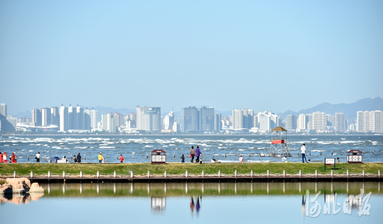 秦皇岛市北戴河鸽子窝,市民正在碧海蓝天中游玩。河北日报记者赵杰摄