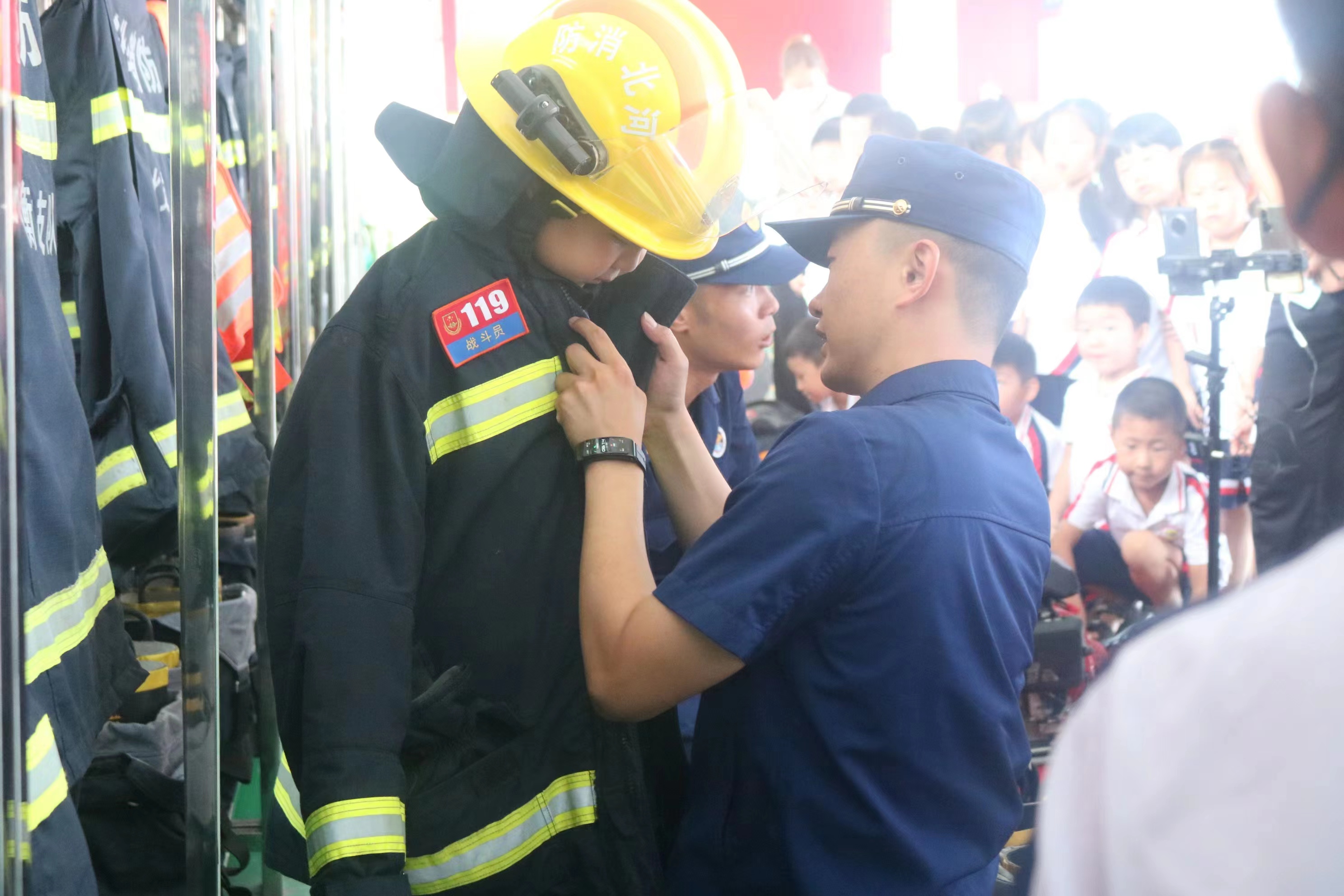 小朋友们试穿了战斗服、抢险救援服,并进行了简单的队列训练,亲身体验了一次当“小小消防员”的感觉。此外,指战员还向孩子们强调了日常生活、学习中用火、用电、玩水存在的安全隐患,以及怎样在危险情况下进行自救,以寓教于乐的方式在师生们的心里种下了消防安全的种子。
