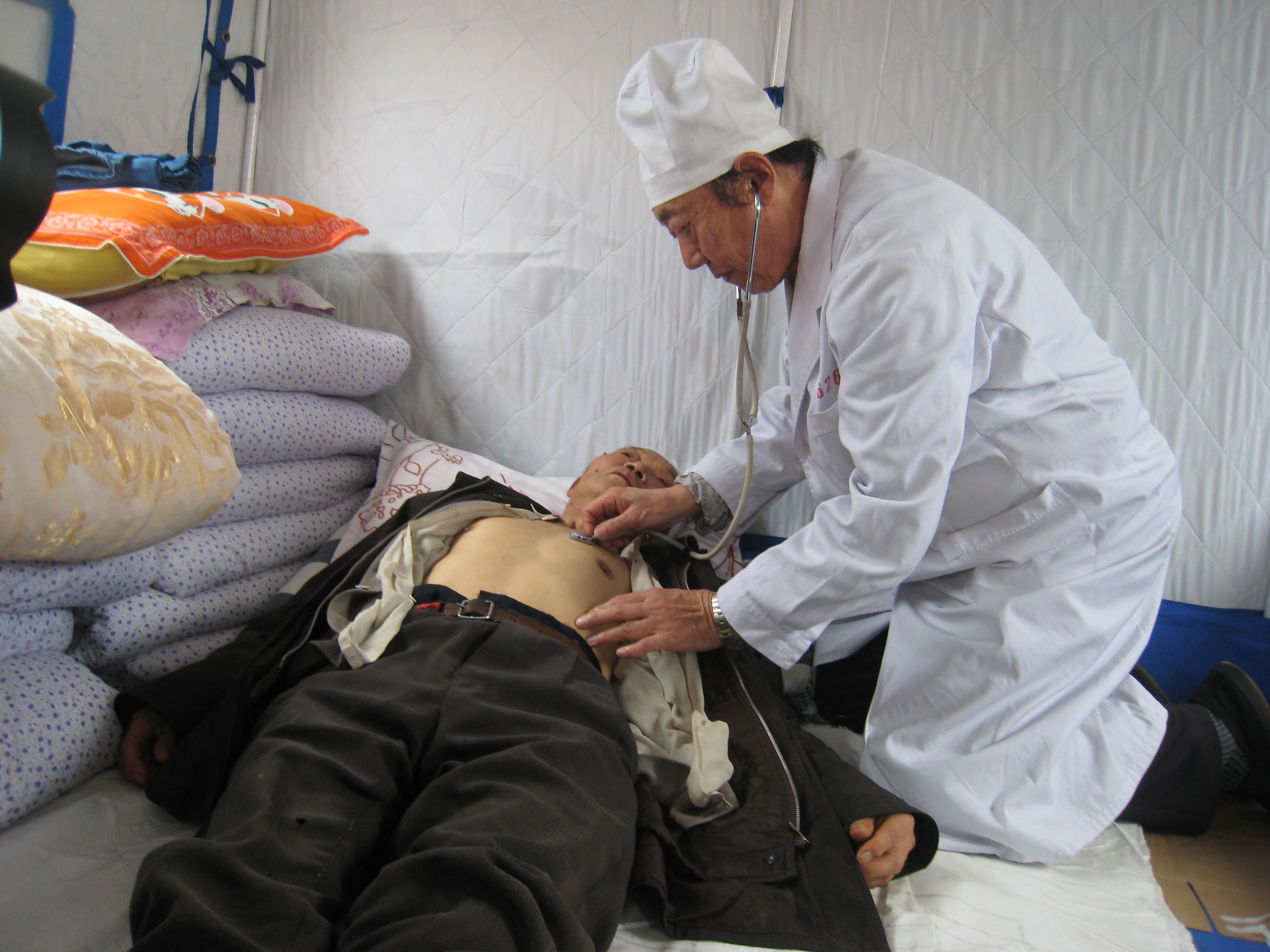 帐篷里吴殿华跪着诊治伤员。张占祥摄