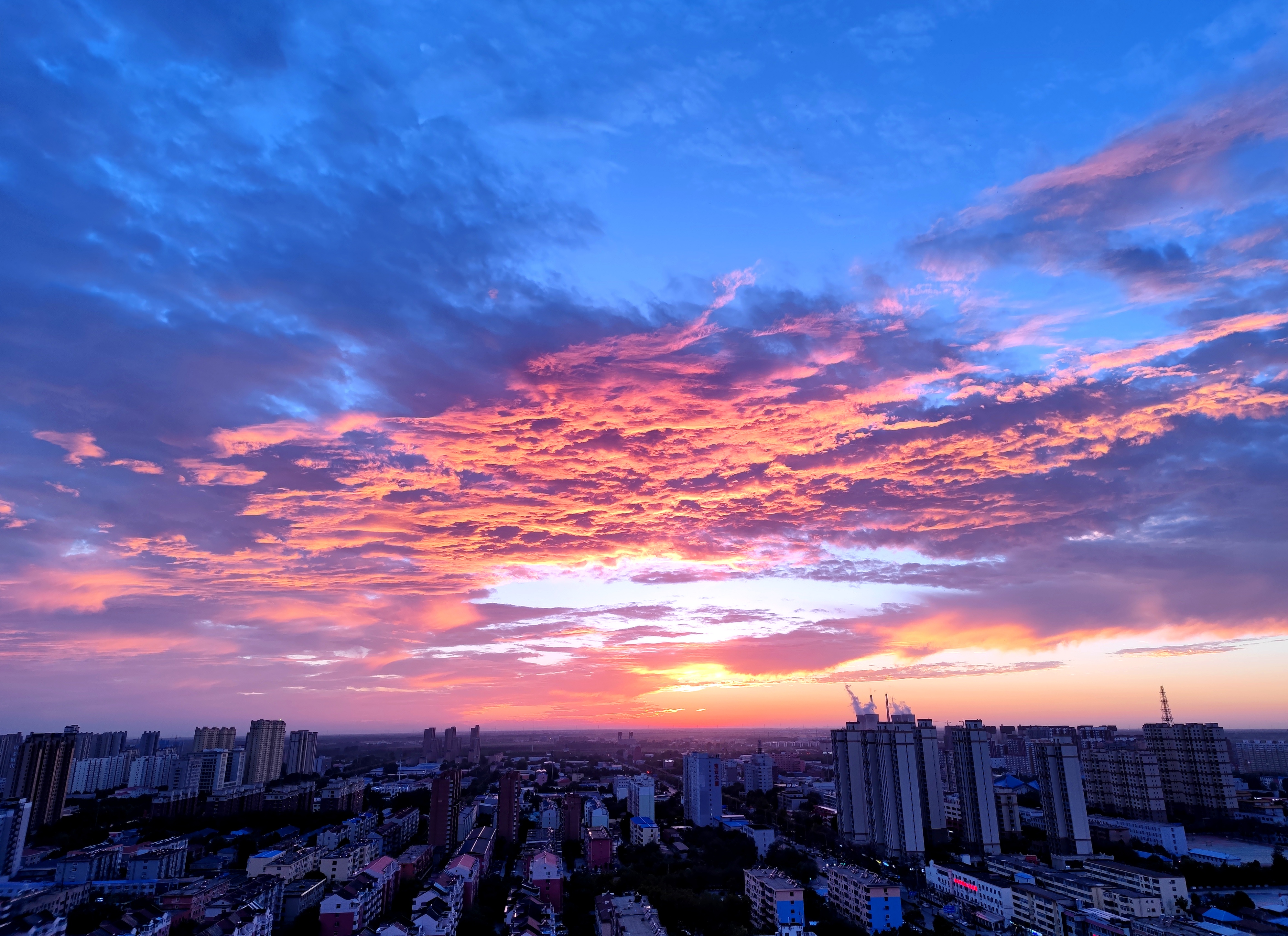 连日阴雨天气过后,15日,我市的天空终于迎来蓝天白云。到了傍晚,随着夕阳缓缓沉入天际,漫天白云被夕阳的余光渲染成了或浅或深的橙红晚霞。整个天空如油画般绚烂多彩,日落余晖与大地楼宇交相辉映,层层叠叠的红霞铺天盖地格外壮观。不禁让人想起小学语文课本里写的:“天上的云从西边一直烧到东边,红彤彤的,好像是天空着了火。”