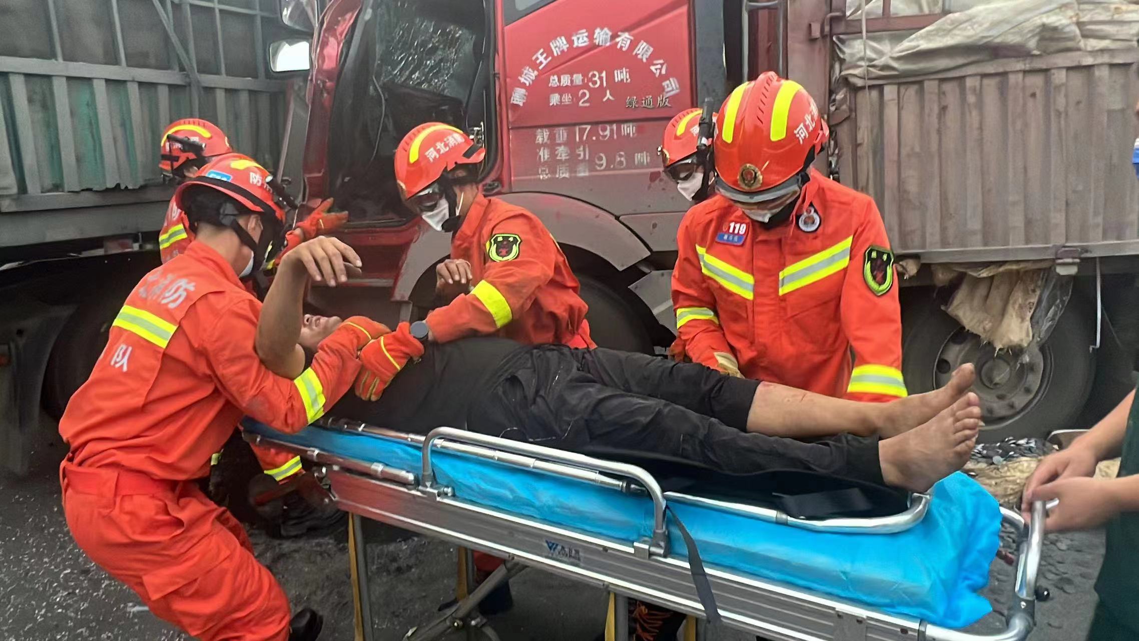 到达现场后,经侦查为两货车相撞,后方货车车头发生撞击后严重变形,驾驶员被困于驾驶室内。救援人员首先查看了司机的受困情况,司机意识清醒,并无大碍。救援人员随即使用破拆工具组对货车门体进行破拆,其他救援人员对货车周边及车辆进行警戒。救援过程中,为缓解被困人员紧张情绪,消防救援人员不断与被困人员进行沟通。经过紧张救援,司机被成功救出并交由现场医护人员。
