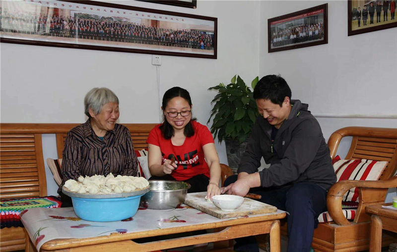 马红与尹广生(右)陪老人包饺子 资料图片