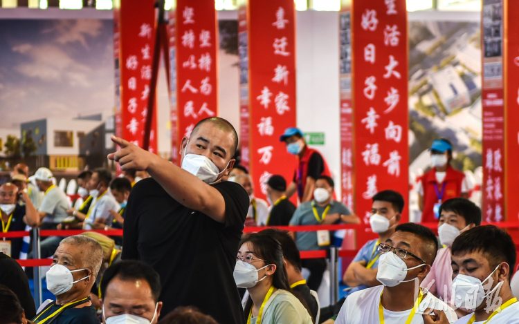 8月15日,雄东片区首批安置住房分配现场摇号工作摇号区,居民向工作人员咨询相关问题。 河北日报记者李东宇摄