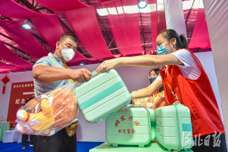 8月15日,雄东片区首批安置住房分配现场摇号工作摇号区,居民在摇号完成后领取回迁留念礼品。 河北日报记者李东宇摄