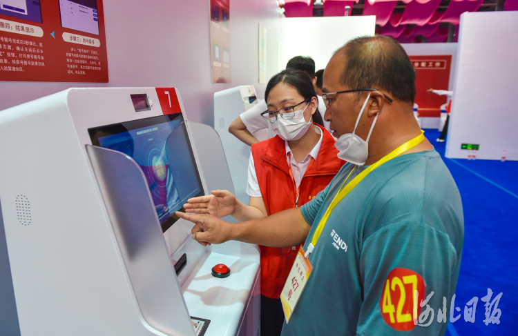8月15日,雄东片区首批安置住房分配现场摇号工作摇号区,居民在工作人员的帮助下完成结果确认。 河北日报记者李东宇摄