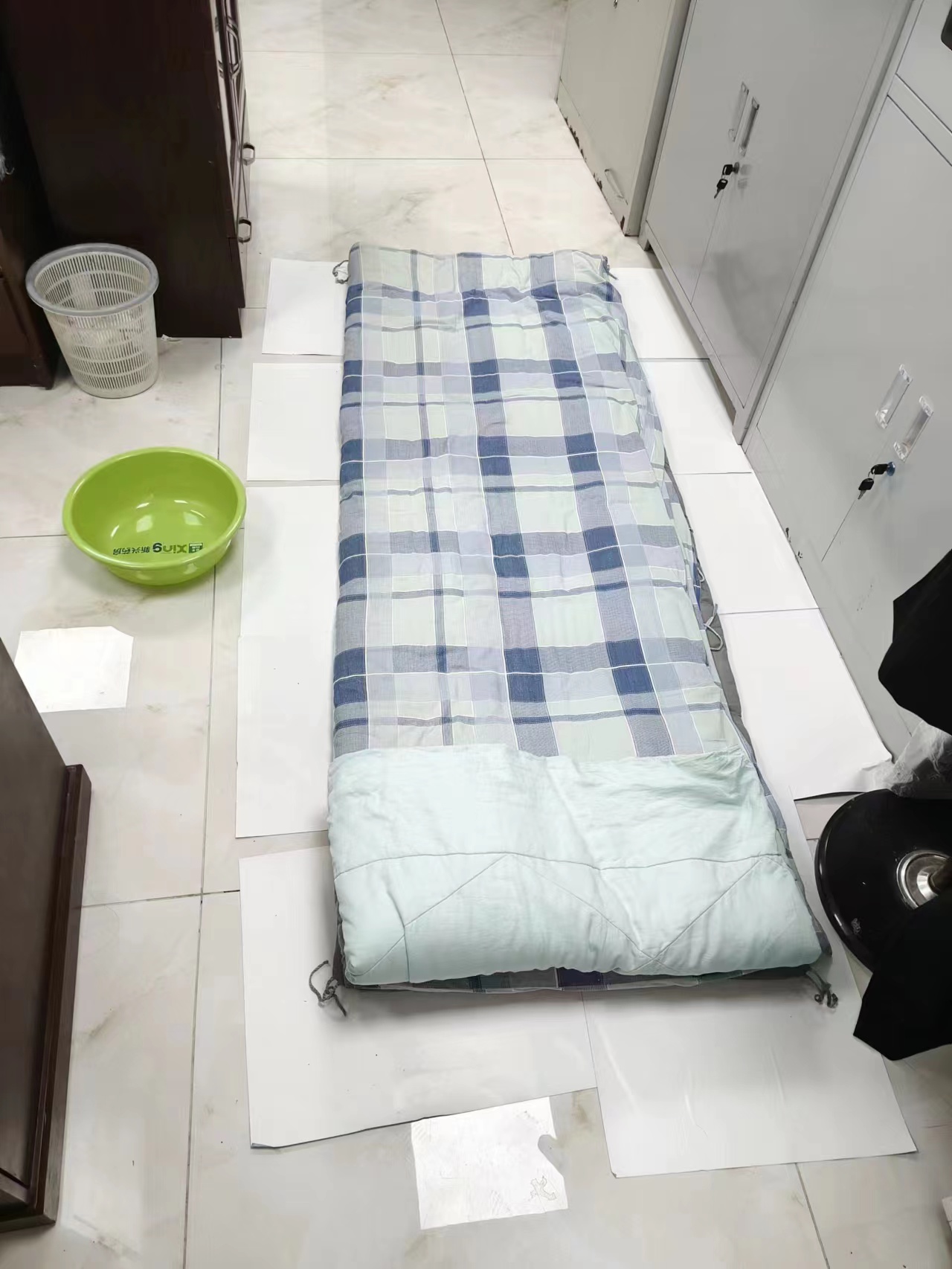 防控任务部署紧急。闷热的八月,每天工作回来衣服已经湿透,两身执法衬衣也是晚上洗、白天穿,有时空气太过潮湿,尹丹阳就穿着半湿的衣服继续工作。他的办公室地上铺着的几个纸板,就是尹丹阳的“床”。核酸采集数据量大风险性高,常常六七个小时无法喝水,几天工作后,尹丹阳嘴里起了溃疡,即使这种情况,尹丹阳未退却一步。