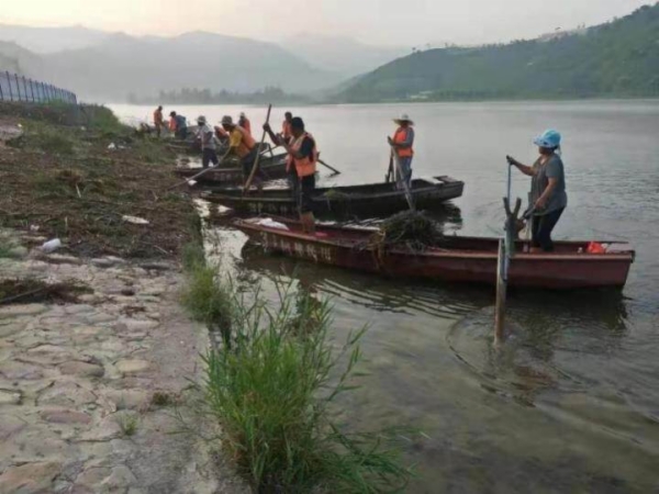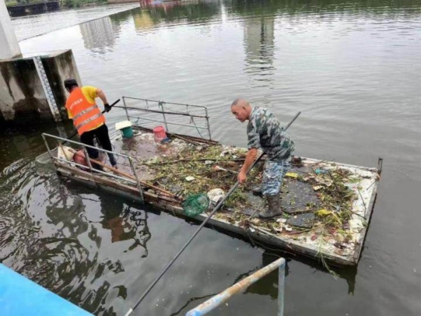 8月19日,前一晚大雨过后,我市水面保洁队伍立刻出动,清理大雨冲刷到河里的垃圾和杂物。(图片由市河长办提供)