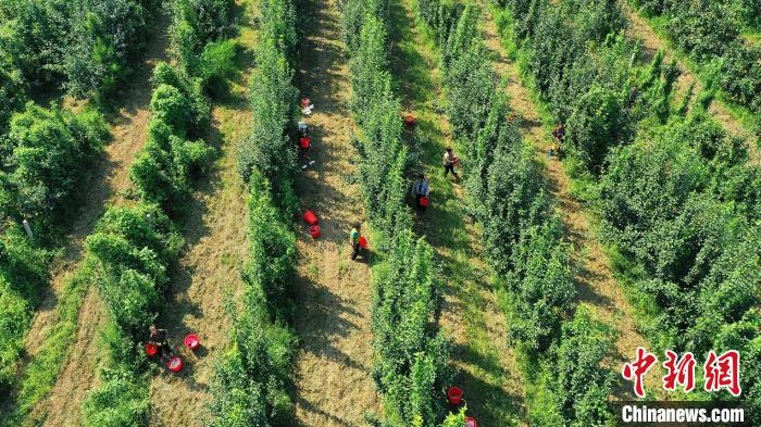 果农在采摘梨果。(无人机照片) 苗凤强 摄