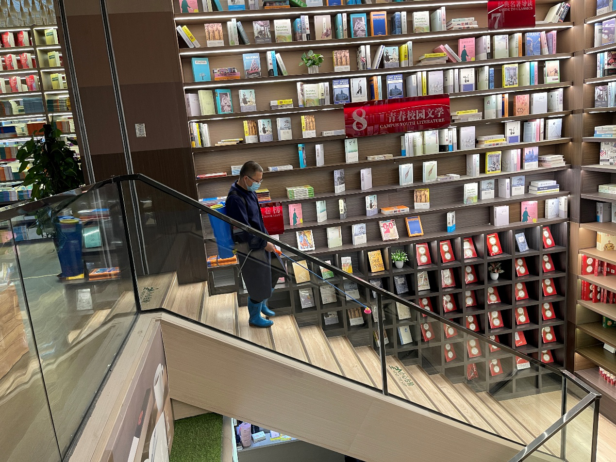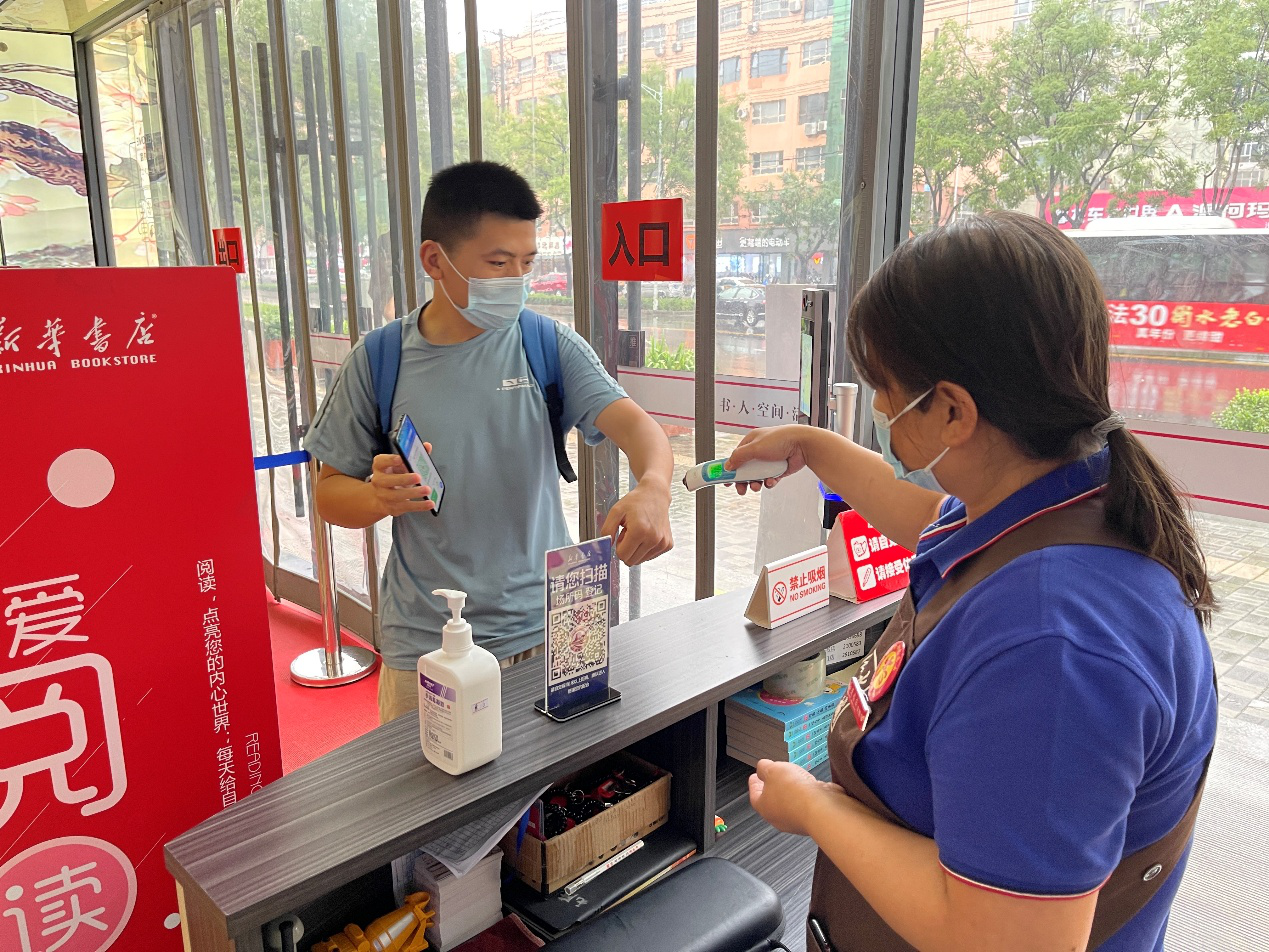 “请出示健康码、测量体温……”上午9时许,在位于市区和平路的市新华书店内,工作人员正在严格按照防疫措施对进店读者进行查验。查验两码、测量体温、手部消毒、扫码登记……每一位读者进店都需全程佩戴口罩并经过严格的检查。“恢复营业后,陆续有不少读者来选购图书,读者的阅读热情很高。”市新华书店工作人员介绍,今天早晨,接到解除静默管理的通知后,新华书店第一时间通知所有人员提前到岗,为了给广大读者营造洁净放心的阅读和购书环境,书店所有员工各司其职,对店内进行了全方位无死角消杀,重点对收银台、扶梯、书架、阅读区、卫生间等区域进行反复消毒、擦拭。工作人员表示:“请广大读者朋友放心,书店已经经过了全面消杀,环境安全洁净,大家可以放心读书和选购。”