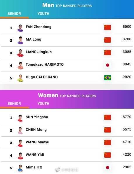 当地时间22日,国际乒联更新本年度第34周世界排名。男单方面,樊振东、马龙、梁靖崑继续排名前三。孙颖莎、陈梦、王曼昱、王艺迪包揽女单前四,日本名将伊藤美诚位列第五。此外,王曼昱孙颖莎女双世界第一。