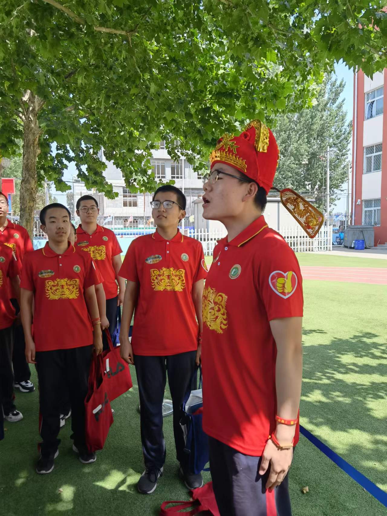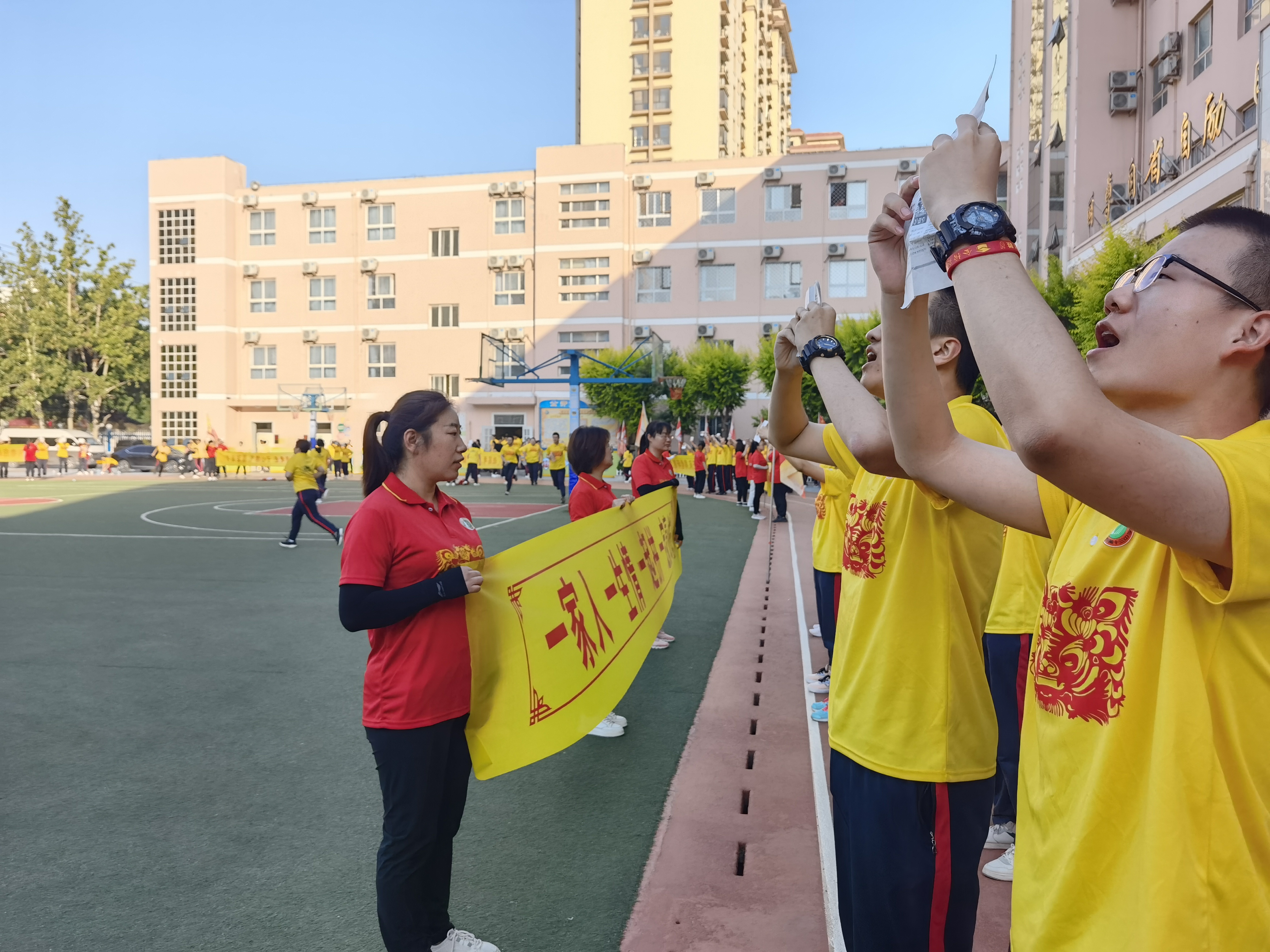 大课间跑操是每天的“规定动作”。下课铃响起后,作为体委的杨潭林立即从教室向操场飞奔。在班级的位置站定后,他拿出小资料,并将其举过头顶,大声读起来。待全部同学集合完毕,杨潭林和同学们随着口令跑动起来,踏着整齐的步伐,喊着震天的口号——“十三加油,十三必胜,十三崛起,十三无敌”。