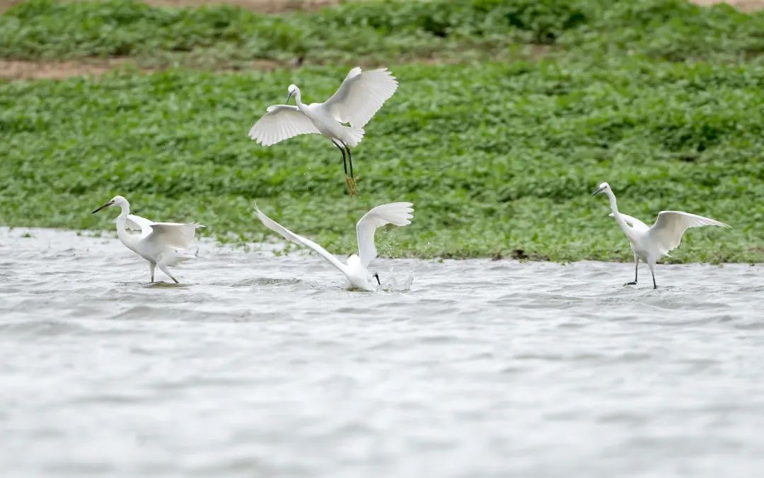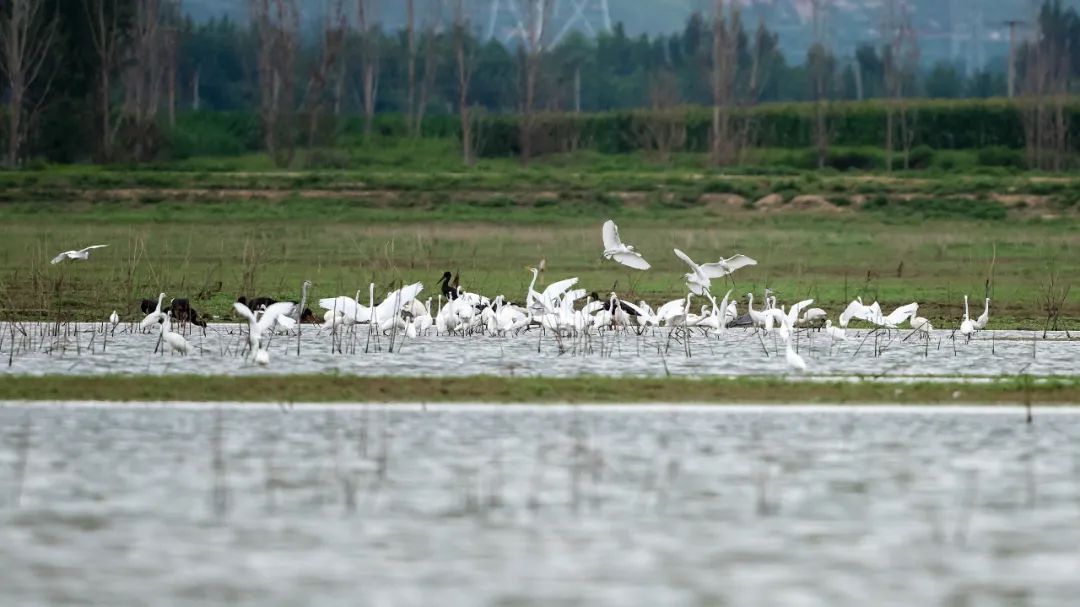 鸟飞鱼跃,生机盎然。这里近期出现了国家一级保护动物黑鹳30多只,国家二级 保护动物白鹭249只
