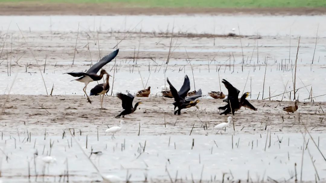 只见这些水鸟有的在空中飞,有的在水中游,有的在觅食,有的安闲自得地站在沙滩上眺望,为雨后平静的库区增添了一分灵气与活力。据了解,黑鹳有“鸟中的熊猫”之称,为国家一级野生保护动物,白鹭属于国家二级重点野生保护动物。这些鹳类、鹭类、鹬类等都属于涉禽,也就是适应在沼泽和水边生活的鸟类,为湿地水鸟。其主要特征是嘴长、颈长、脚长,适于涉水行走,不适合游泳,休息时一脚站立,从水底污泥中或地面获取食物。