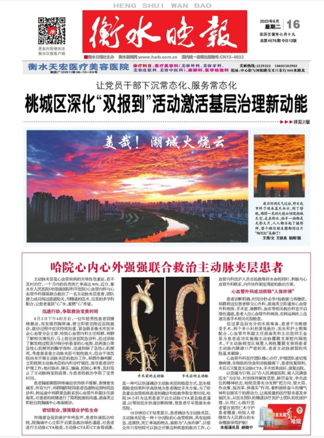 记者:我们在成功救治患主动脉夹层的一位孕妇后,又成功救治这例正值人生盛年的患者,在衡水激发了强烈反响。请您专门再介绍一下主动脉夹层,方便大家有更深入了解。