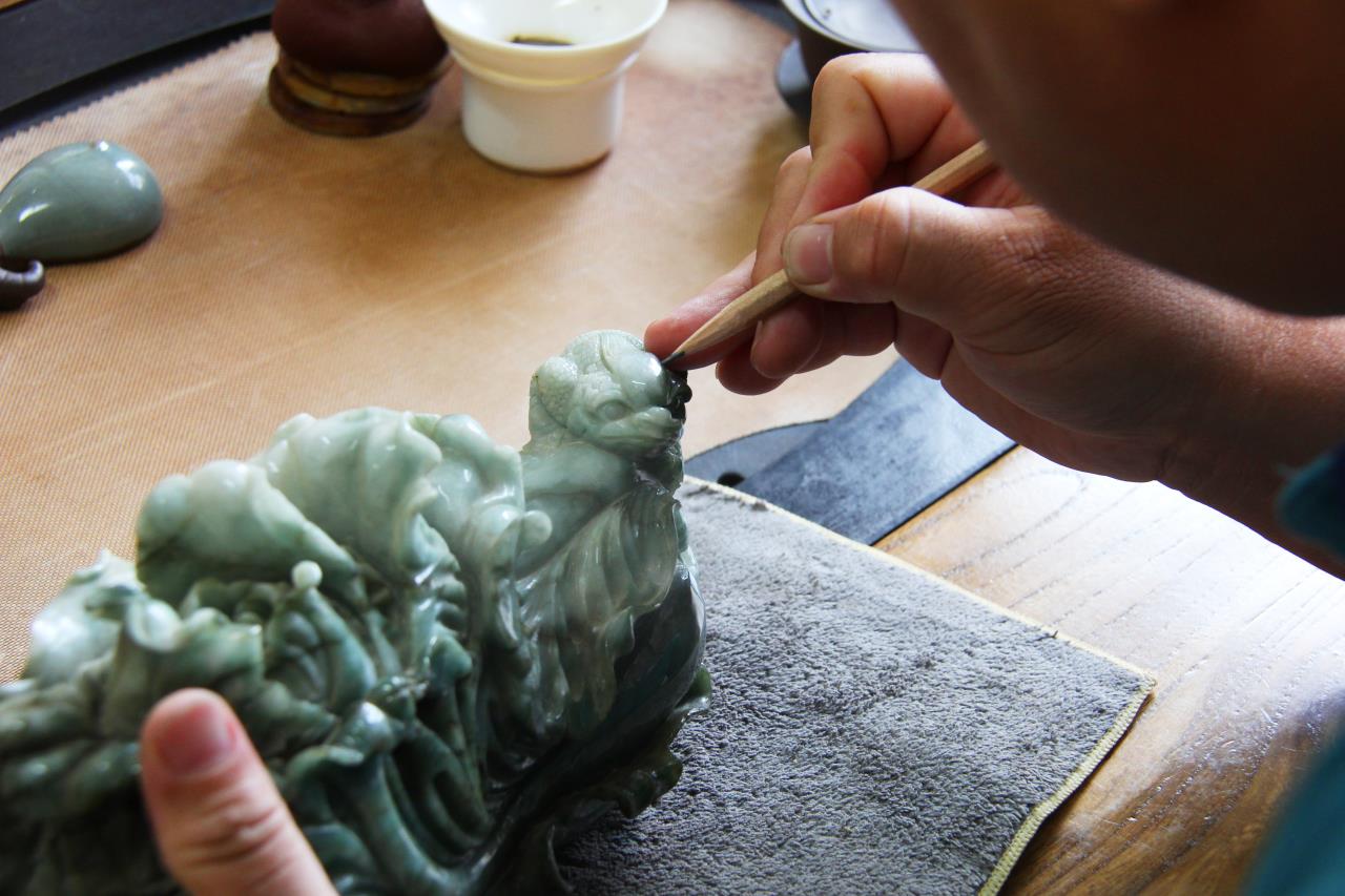 采访中,王涛正摸着手中的玉石料,考量着它的硬度、密度、颜色,构思着合适的图案。他不时拿起铅笔在上面勾线,勾线完成后就要用刻刀在上面慢慢雕刻,为其开槽。“开槽是最难的,这个槽要开得上窄下宽,才能将金子牢牢镶嵌在上面,在纹饰的转弯和衔接处不能看出接头,要特别仔细。”王涛说,“错金银技艺不允许用一滴胶水,如果开槽不好,宁可废掉这件器物,也不能用胶粘,决不能砸了这门手艺的牌子。”通常,一条线要用刻刀走上四五个来回,一个玉镯刻完常常会用坏30多个钻头。只有这样的精雕细琢,才能让金丝“长”到玉中。