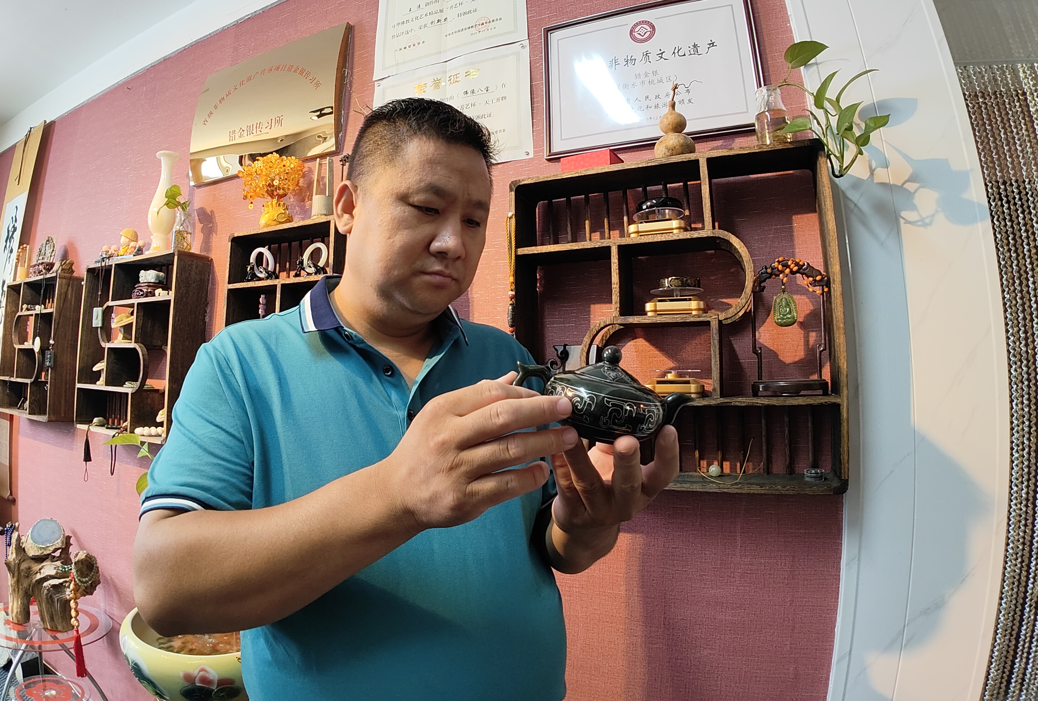 在咱们衡水有这样一位传承中国古代金属细工装饰技法“错金银”的匠人,他坚守匠心,为玉石、瓷器披上“错金银”的彩衣,赋予它们艺术生命,让它们熠熠生辉。他就是43岁的深州籍手艺人王涛。他潜心钻研“错金银”技艺20多年,成为河北省级非物质文化遗产代表性项目“错金银”市级代表性传承人。