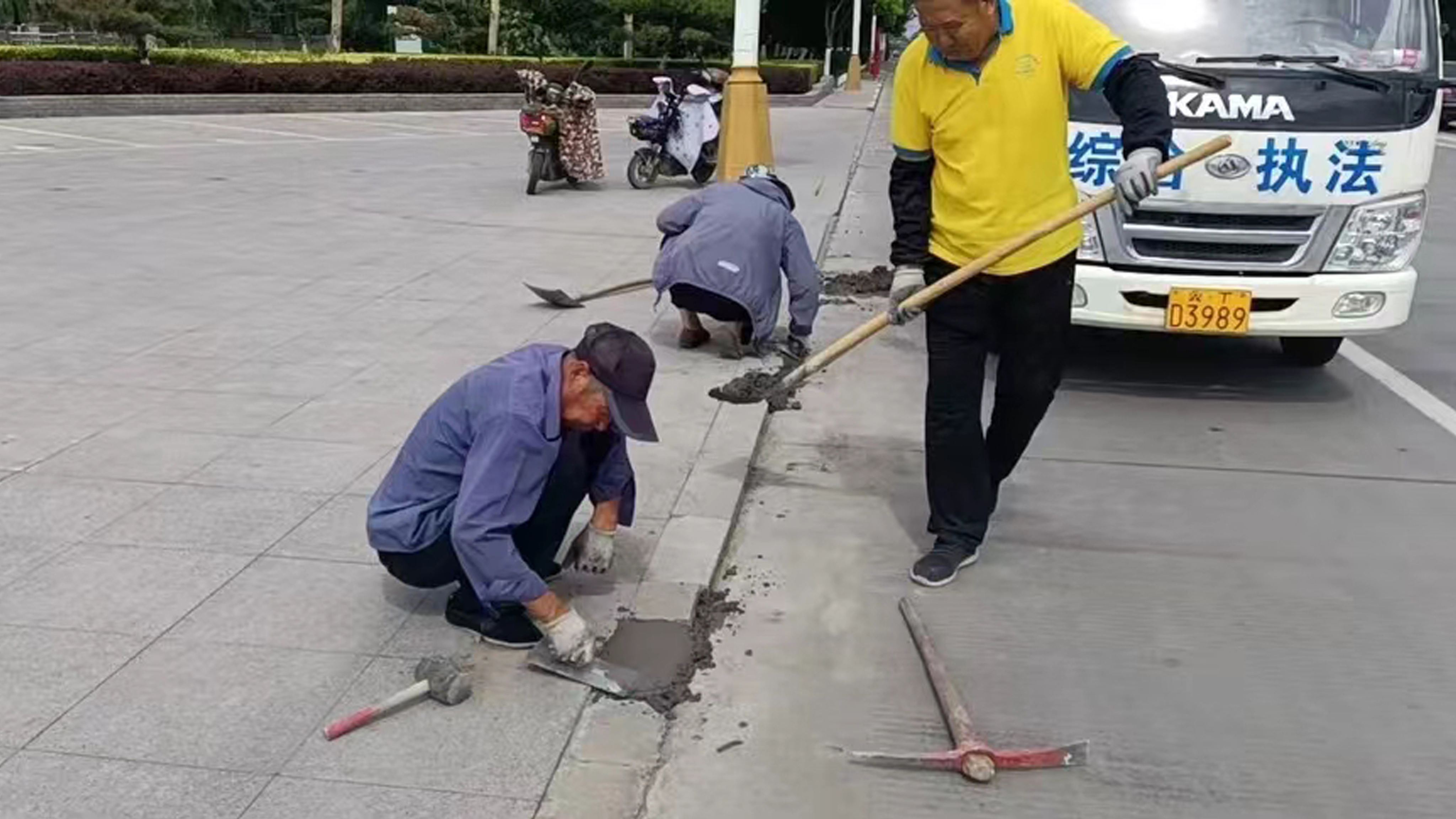 工人对破损的便道砖进行更换,确保路面平整。谢朝华 摄