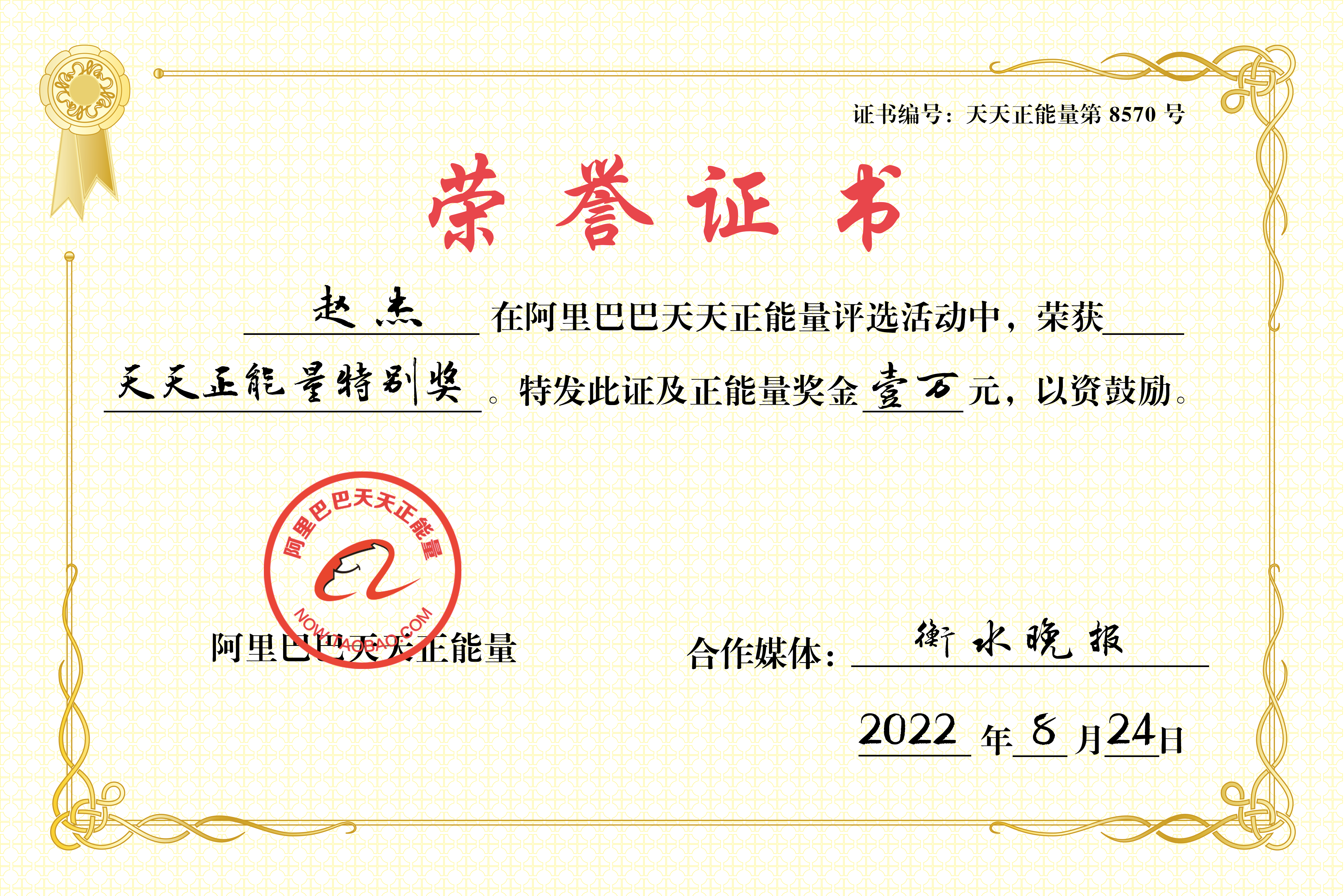 据了解,天天正能量是2013年阿里巴巴集团联合全国100多家主流媒体共同打造的大型公益项目,以“传播真善美,弘扬正能量”为宗旨,以“你怎样,世界就怎样”为口号,通过奖励小而美的凡人善举,唤醒人心,激励善行,推动社会向善向暖,“让好事随风传千里,让好人马上得好报”。项目至今已发放奖励金9600多万元,有上万名各行各业的基层群众获奖,这些普通人成为人们学习和效仿的榜样,影响和带动着越来越多的人向善看齐。