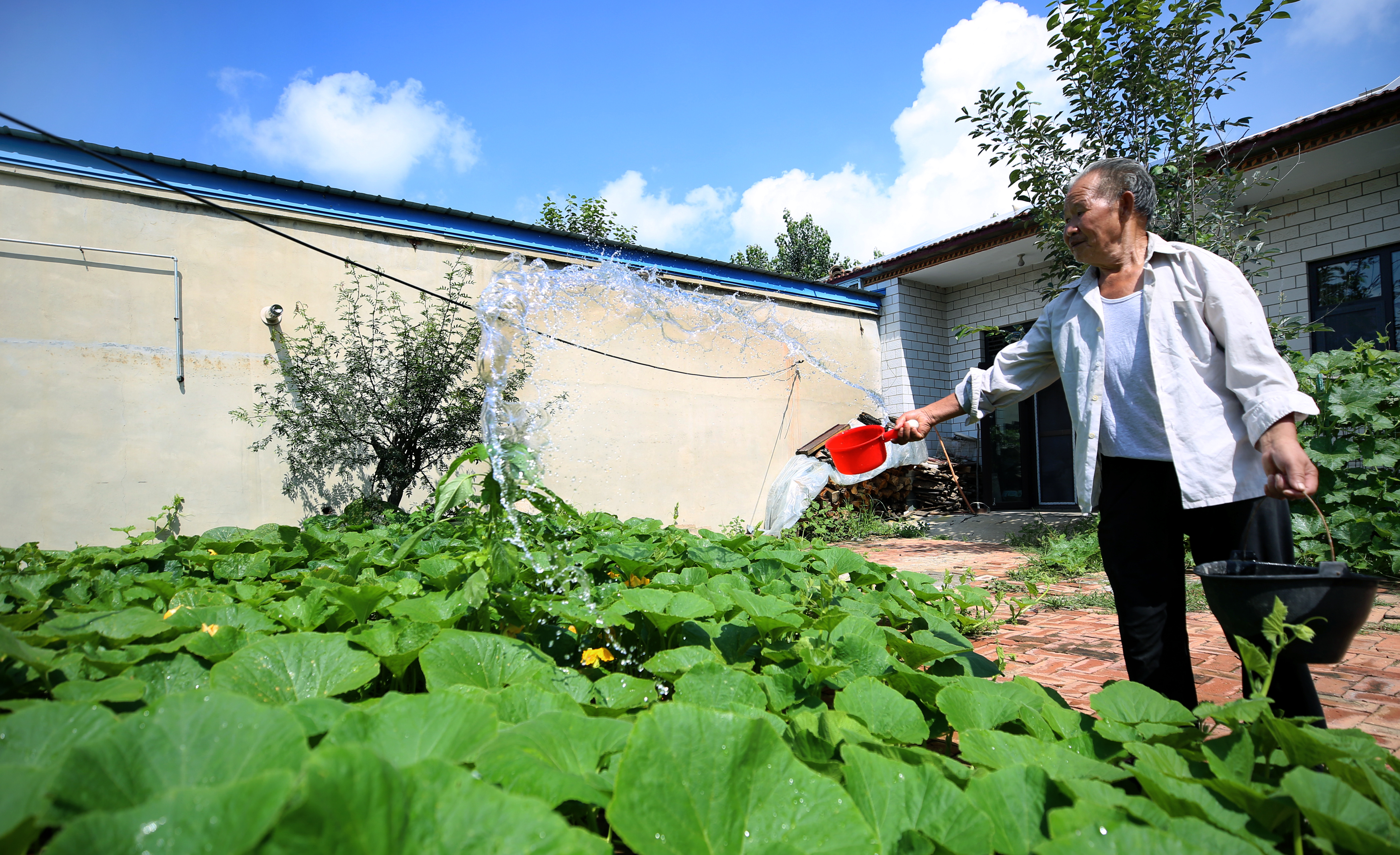 景县苦水营村村民正在用长江水浇菜。