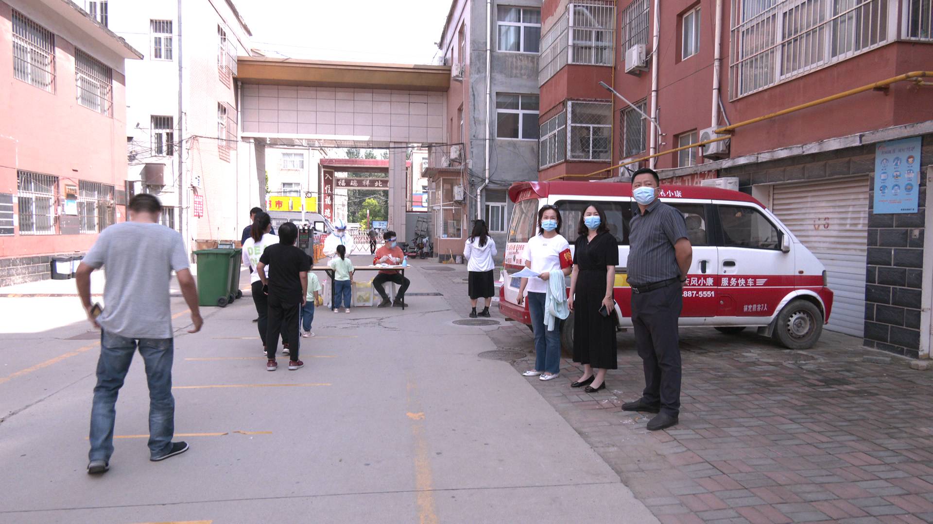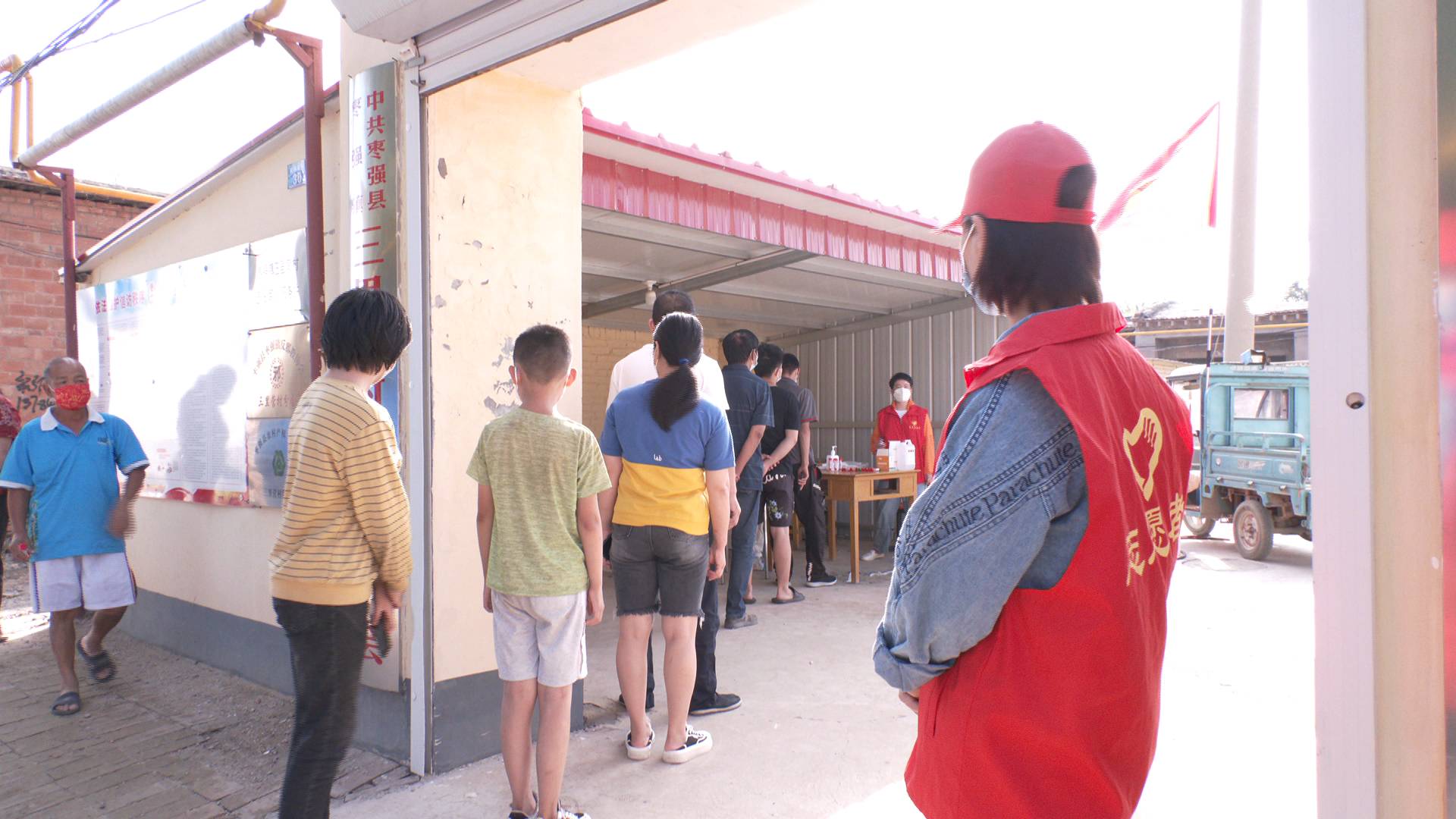 在枣强镇三里营村,村民在志愿者和村干部的引导下,严格按照疫情防控要求有序进行采样。