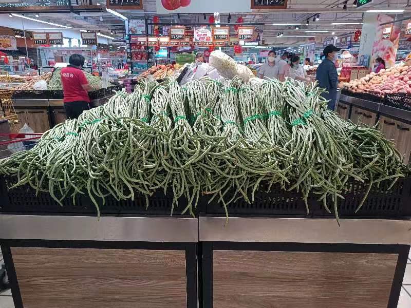 天色微明,东明蔬菜果品批发市场内早已是一派车水马龙的繁荣场景。豆角、土豆、青椒、茄子、香蕉……数以万计的果蔬被运往各个市场、商超。在市区各大商超门店里,琳琅满目的商品摆满了货架,各类商品分门别类摆放整齐、应有尽有,月饼等中秋节庆商品摆在醒目位置。市民们戴着口罩,扫码测温,保证间隔距离,精心挑选自己需要的商品。