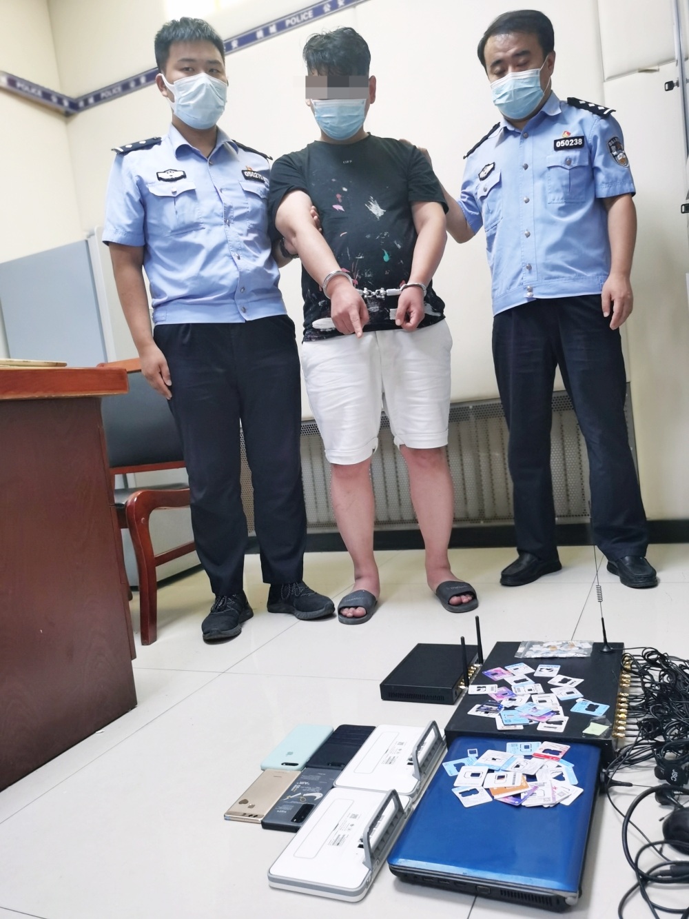 时间一分一秒地过去,两名嫌疑人迟迟没有出来的意思,考虑到迟则生变,刘兆丰等人改变抓捕策略,迅速进入房间控制了正在利用伪基站实施诈骗的2名犯罪嫌疑人,现场查扣1台笔记本电脑、2部GOIP设备、2部无线路由器、4部手机、114张手机卡……