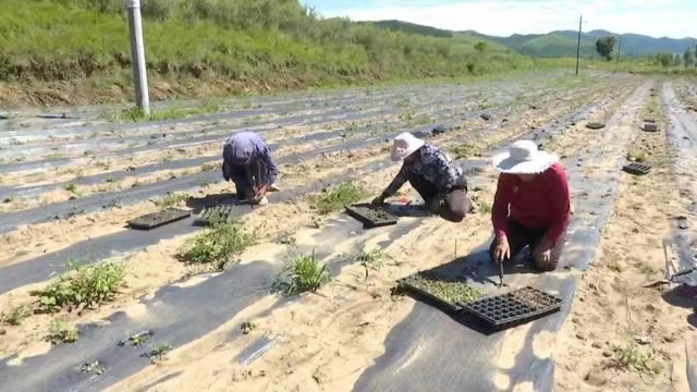 村民正在金莲花基地补苗。