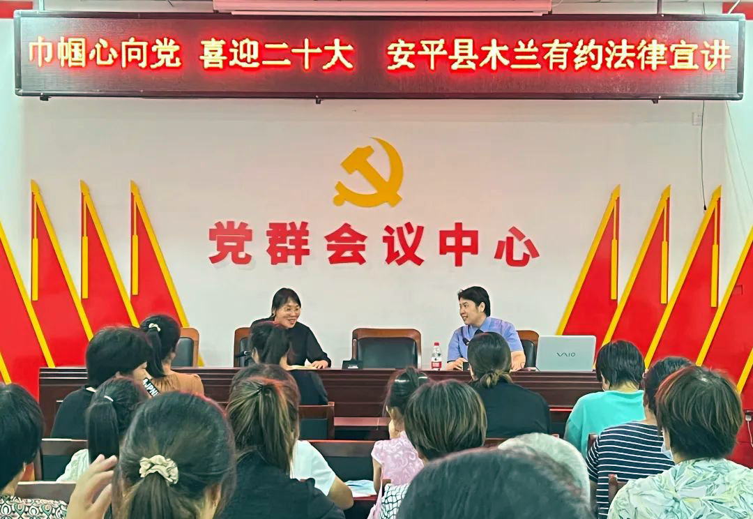 为深入实施“八五”普法规划,切实提升广大妇女群众尊法学法守法用法意识和法治素养,近日,衡水市安平县妇联联合县检察院、东黄城镇妇联,在大同新村开展了以“巾帼心向党 喜迎二十大”为主题的“木兰有约”巾帼法治宣讲活动。