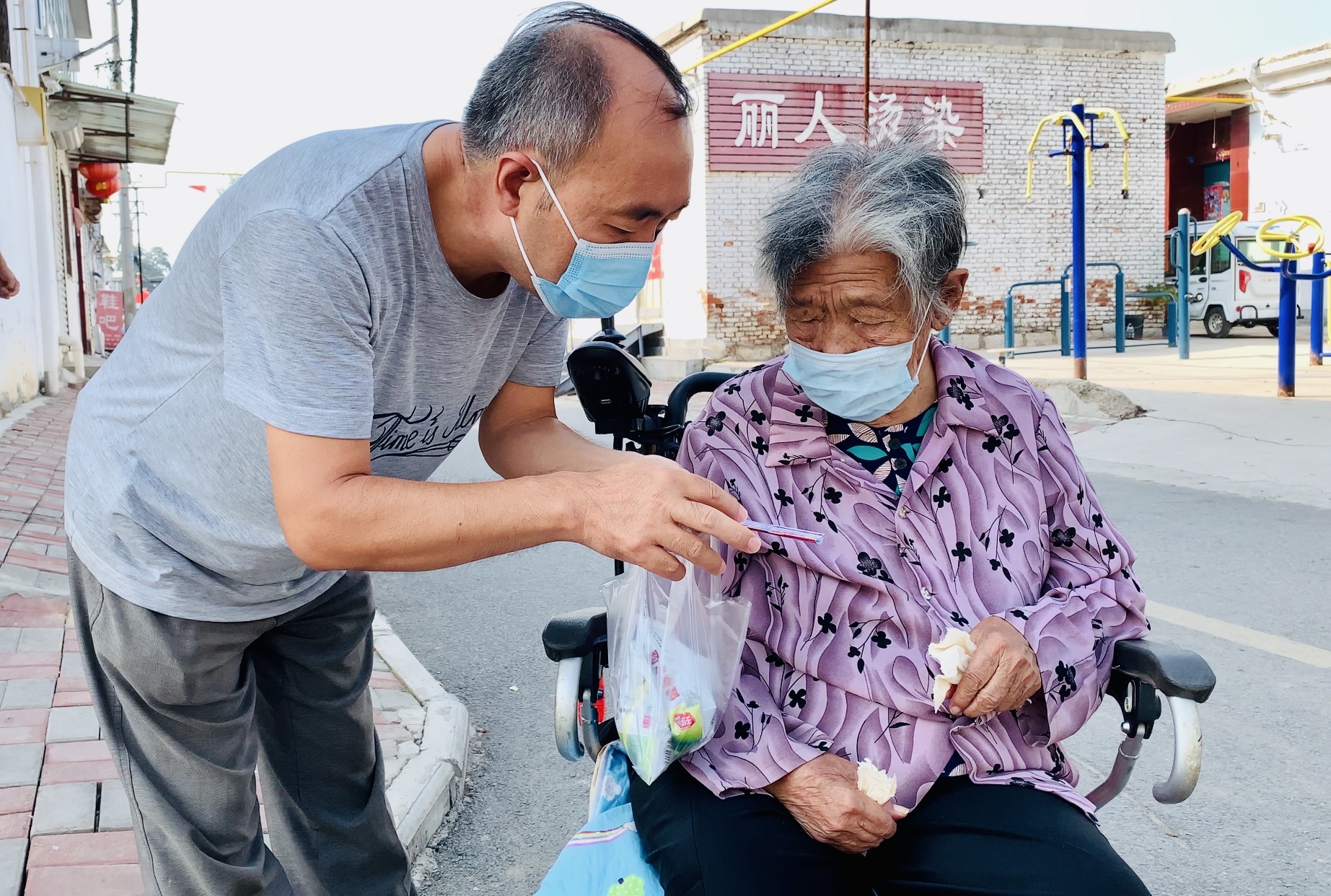 今年53岁的村民王占军用轮椅推着90岁的老母亲来到积分兑换超市,兑换了两袋醋。他热心村里的公益活动,还是村里人人夸赞的孝敬老人的榜样,10多年来一直照顾着行动不便的母亲。他的母亲是村里最年长的一位老人。
