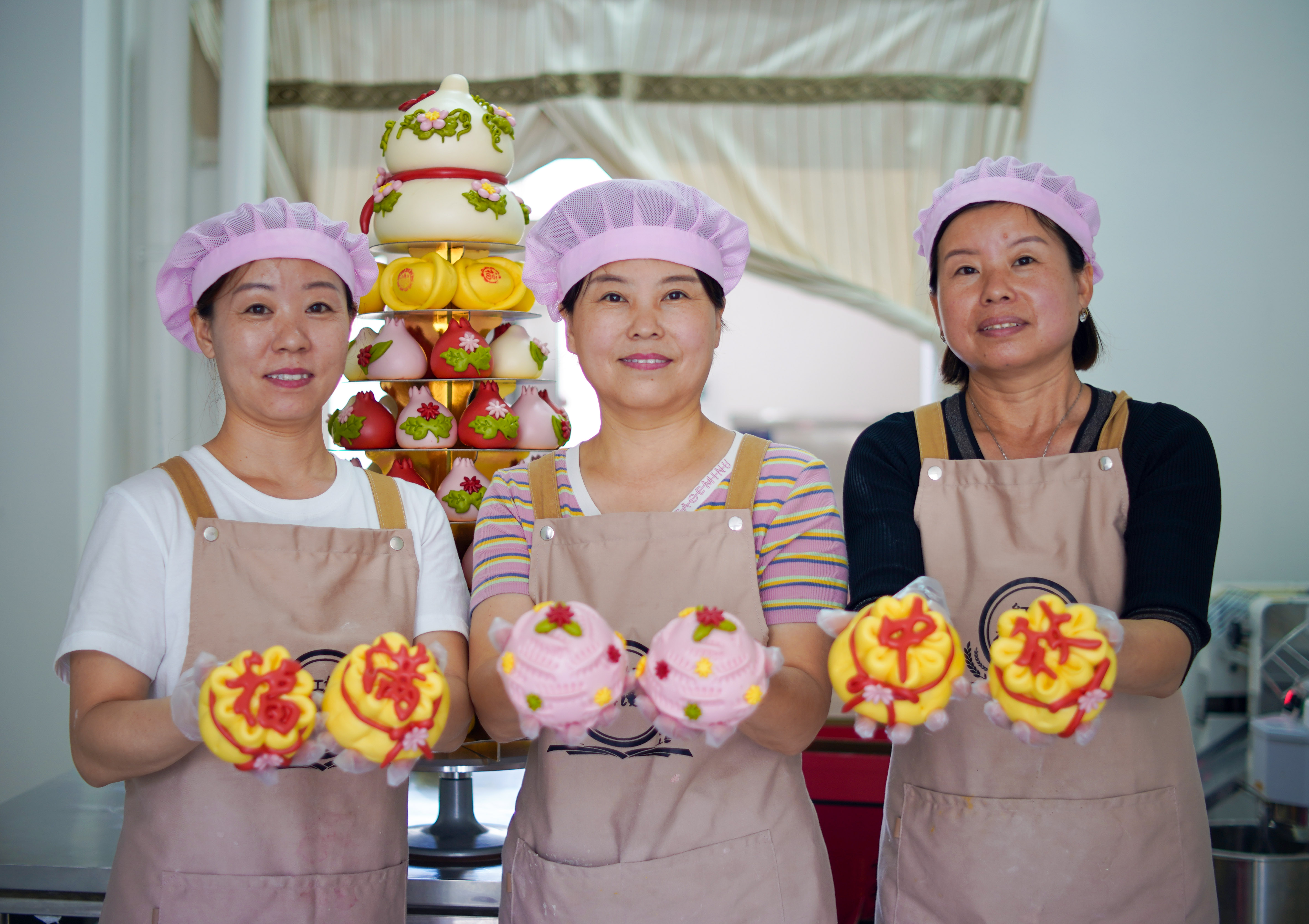 解春红(中)姐妹三人展示“福满中秋”特色“花饽饽”。