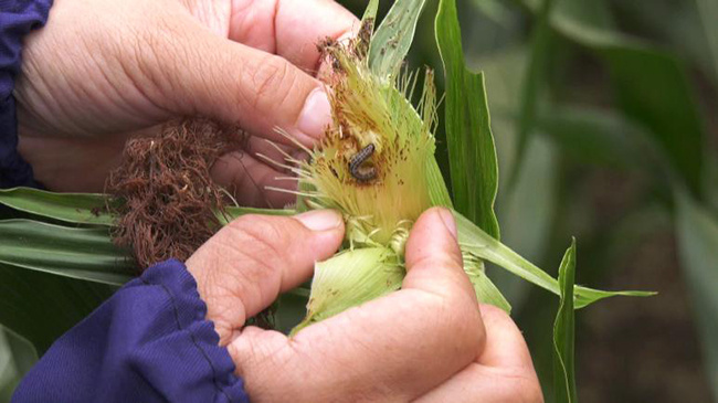 农技人员查看玉米长势和虫害情况,指导农民安全科学用药。李晓宇 摄