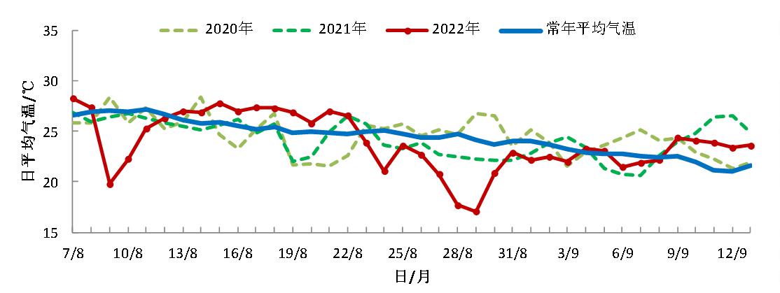 9月8日以来,我市平均气温均高于常年,12日~13日的滑动平均气温在23℃以上,尚不满足秋季标准,今年真正的入秋日将晚于常年。此外,2020年、2021年的入秋日期分别为9月12日、15日,均晚于常年。
