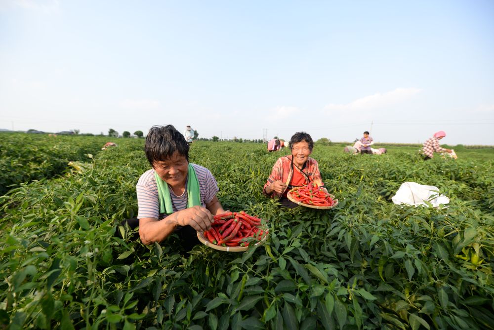 河北鸡泽县农民在地里采摘辣椒。(受访单位供图)