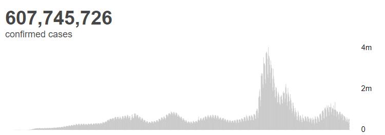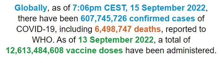 根据世卫组织最新实时统计数据,截至欧洲中部夏令时间9月15日19时06分(北京时间9月16日1时06分),全球累计新冠肺炎确诊病例607745726例,累计死亡病例6498747例。15日,全球新增新冠肺炎确诊病例521174例,新增死亡病例1538例。