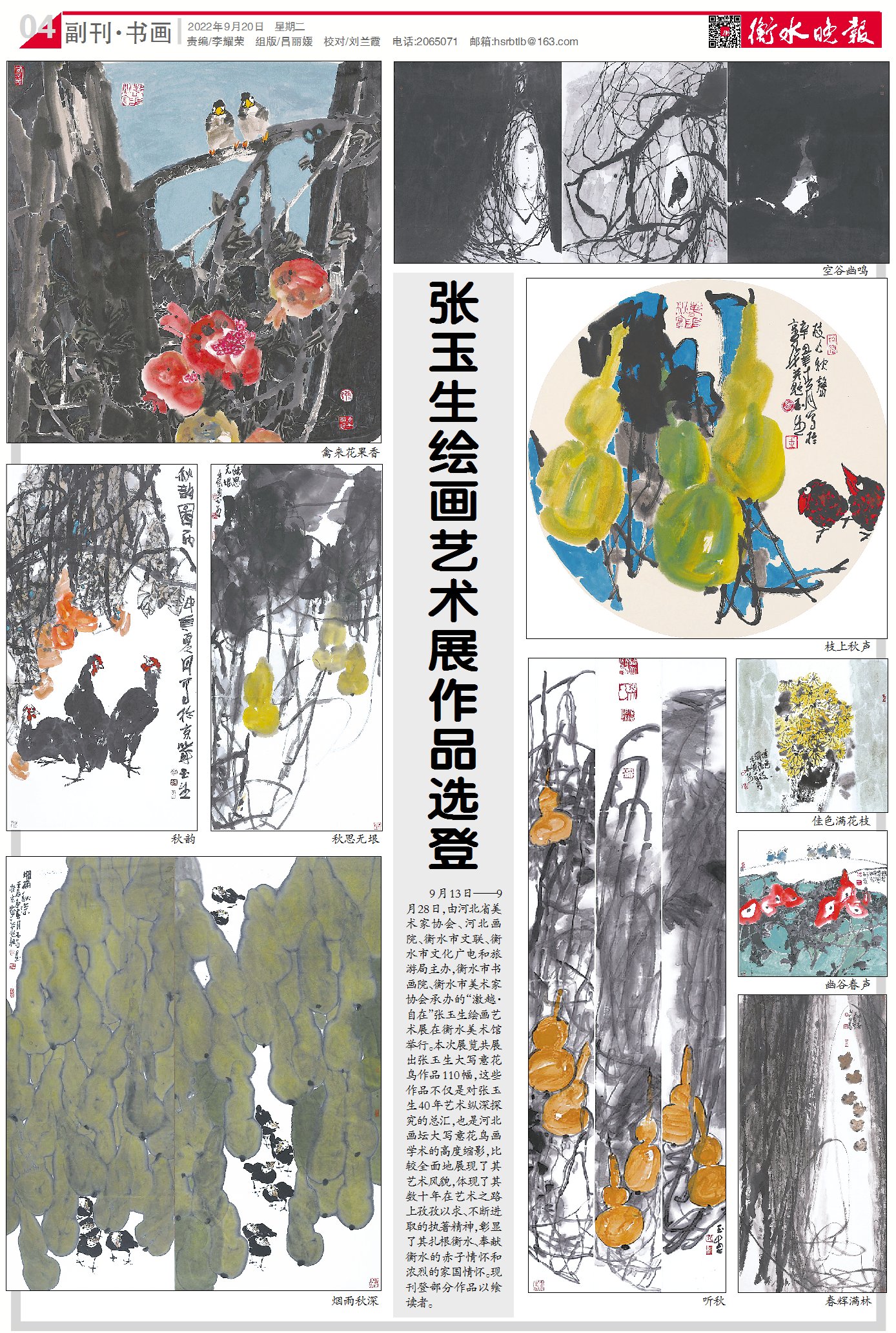 9月13日——9月28日,由河北省美术家协会、河北画院、衡水市文联、衡水市文化广电和旅游局主办,衡水市书画院、衡水市美术家协会承办的“激越·自在”张玉生绘画艺术展在衡水美术馆举行。本次展览共展出张玉生大写意花鸟作品110幅,这些作品不仅是对张玉生40年艺术纵深探究的总汇,也是河北画坛大写意花鸟画学术的高度缩影,比较全面地展现了其艺术风貌,体现了其数十年在艺术之路上孜孜以求、不断进取的执著精神,彰显了其扎根衡水、奉献衡水的赤子情怀和浓烈的家国情怀。现刊登部分作品以飨读者。