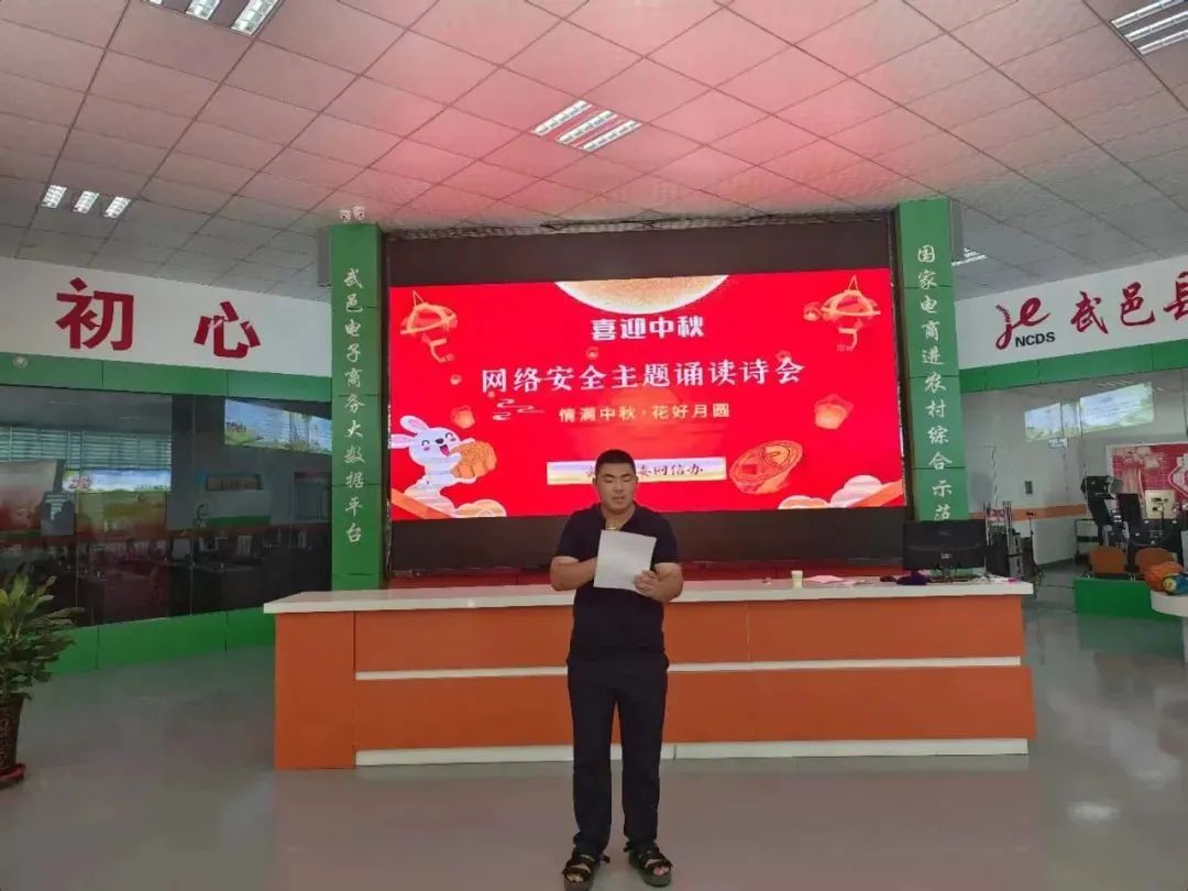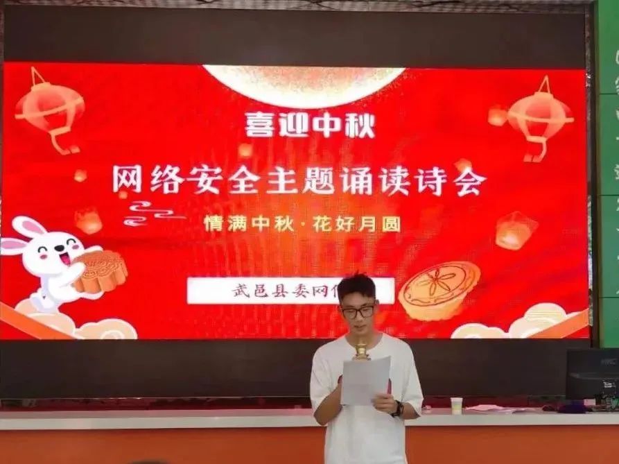 9月8日,武邑县委网信办组织开展以“喜迎中秋·网络安全”主题诵读诗会活动。此次诵读诗会围绕赞颂人民、抒发爱国情怀为主题,通过诵读经典等形式来继承发扬诗歌文化,抒发爱国爱家思乡情怀。朗诵节目《水调歌头·明月几时有》《游子谣》《念奴娇·中秋》等10个精彩诵读节目轮番上演,现场观众掌声阵阵,气氛热烈。
