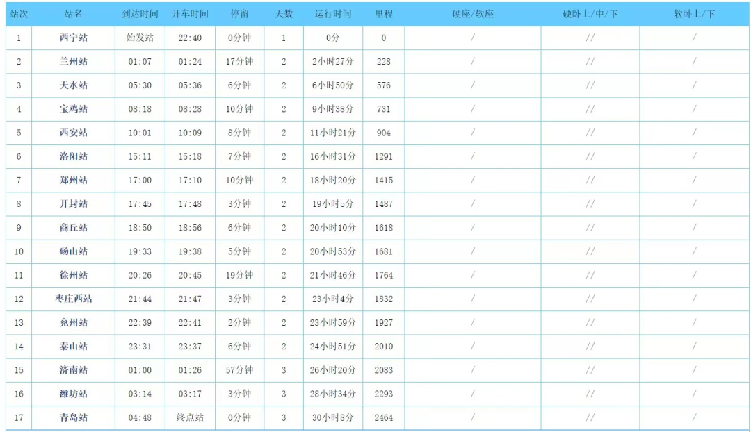 Z274次列车由西宁站始发,终到青岛站,运行时间30小时8分,途经兰州、天水、宝鸡、郑州、济南等多省17站。