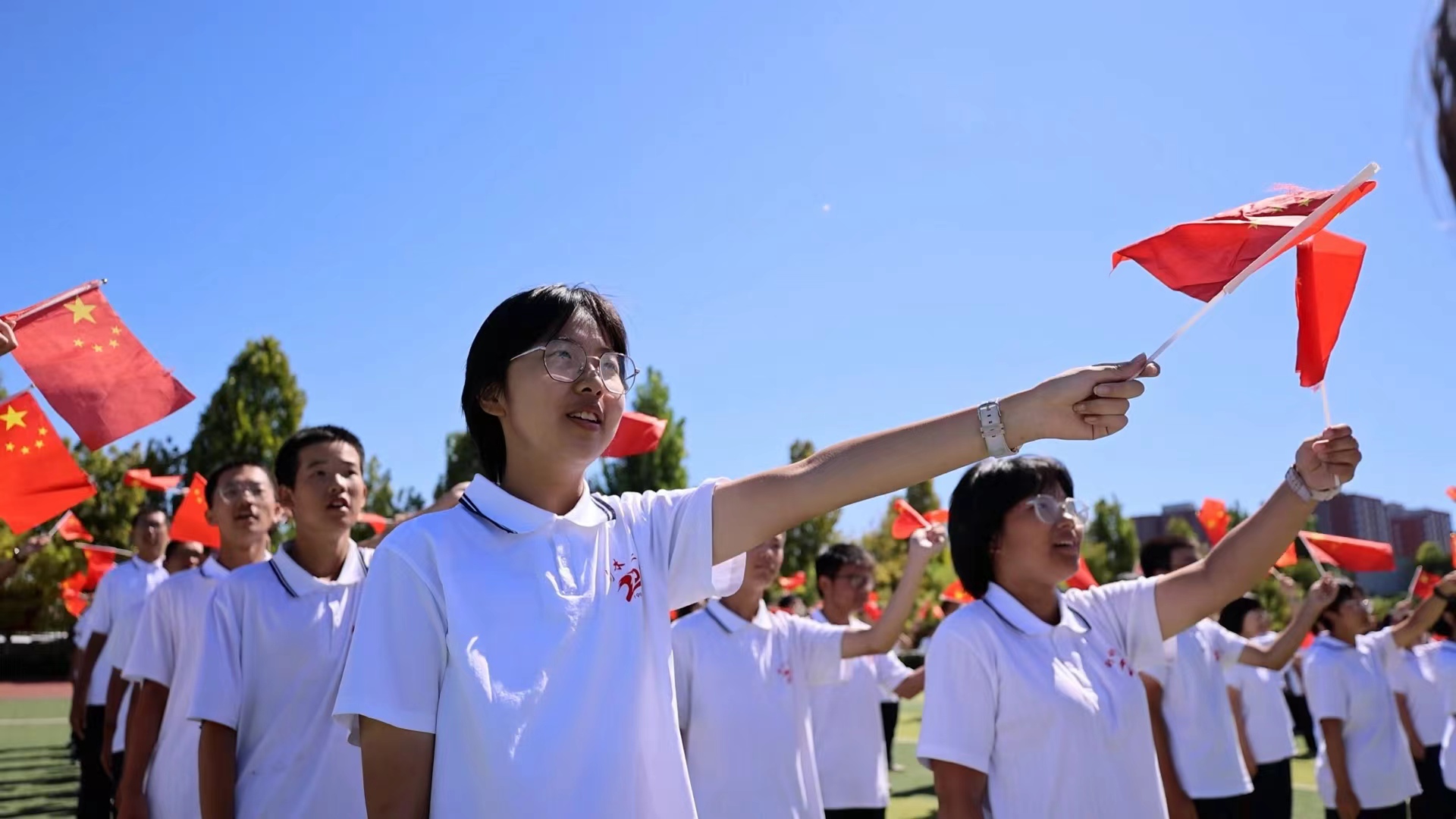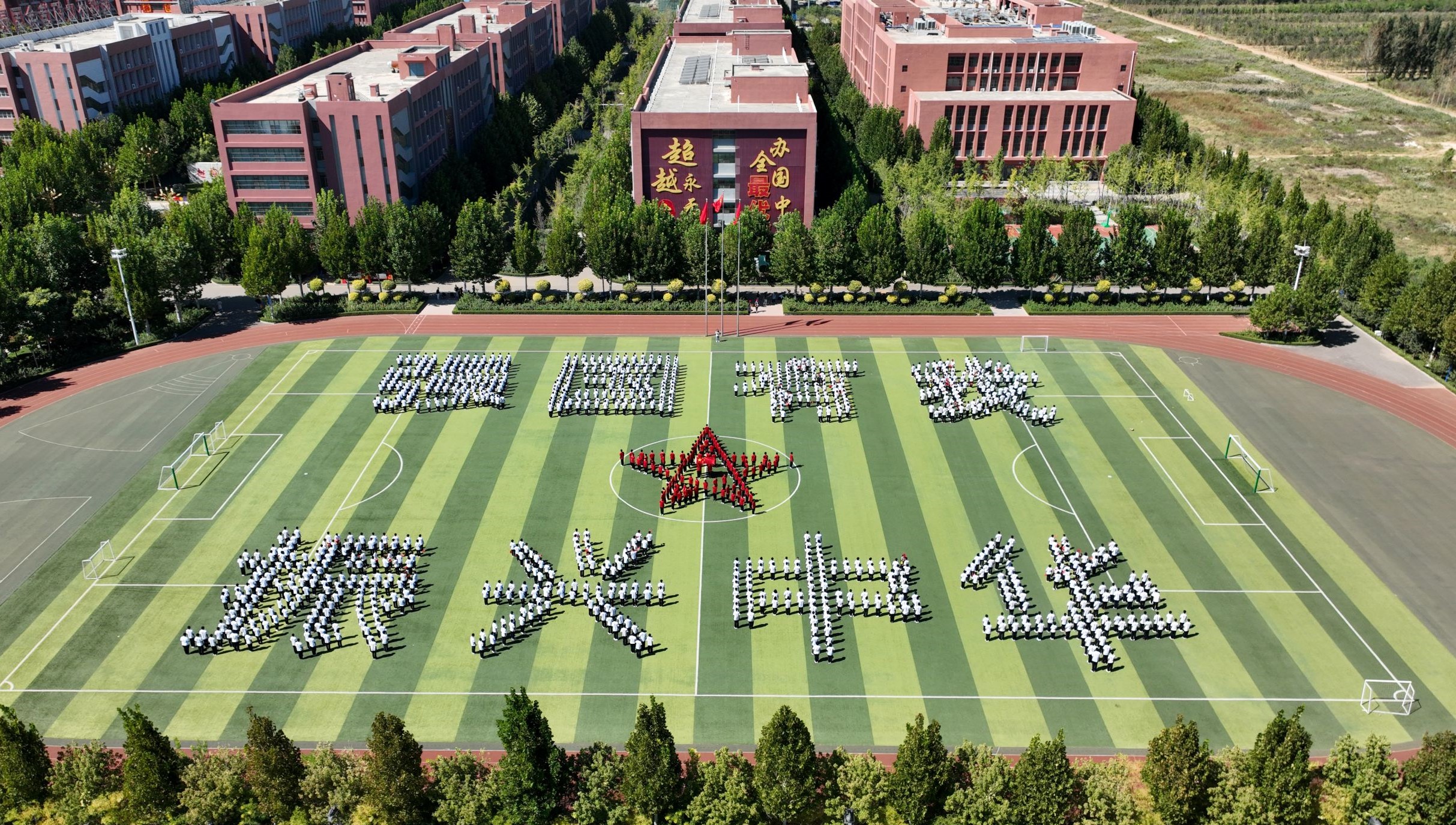 9月26日,衡水滨湖新区志臻中学千余名学生齐聚操场,手拿五星红旗,摆出红色五角星与“强国有我 振兴中华”的巨字方阵,以特殊的方式献礼国庆,传承红色基因,厚植爱国情怀。