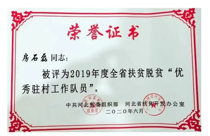 常言道:金杯银杯不如老百姓的口碑。房石磊就是这样一个退伍不褪色,始终保持着军人优良作风的共产党员,踏实干事,尽职尽责,把一颗火热的心献给了扶贫及乡村振兴工作,献给了南里谦村的老百姓。由于他在扶贫工作中的突出表现,被评为2019年度全省扶贫脱贫“优秀驻村工作队员”、河北移动“2019年度驻村精准脱贫个人”、衡水移动“优秀共产党员”等荣誉称号。